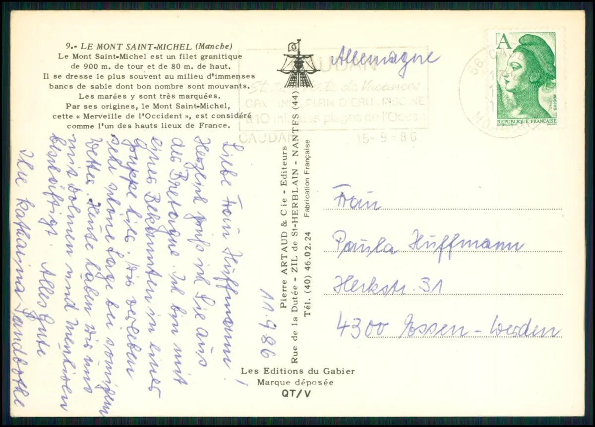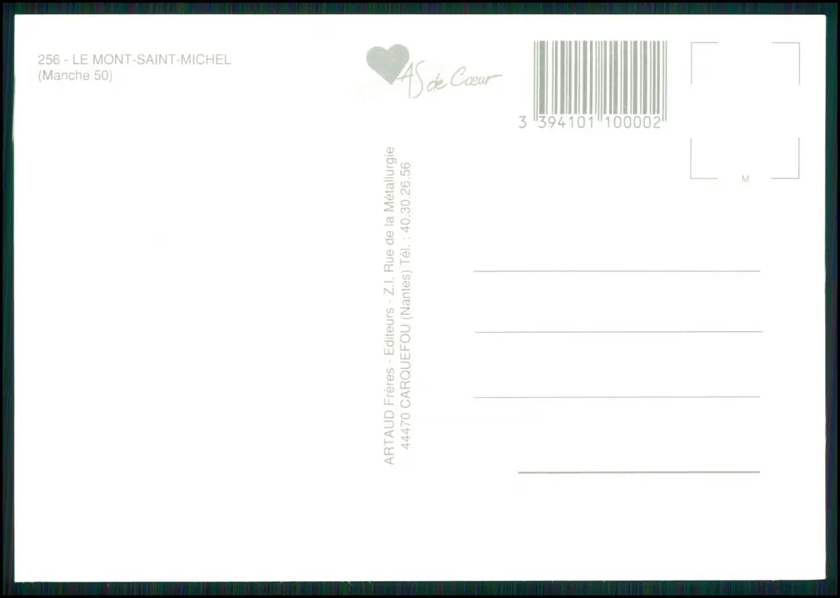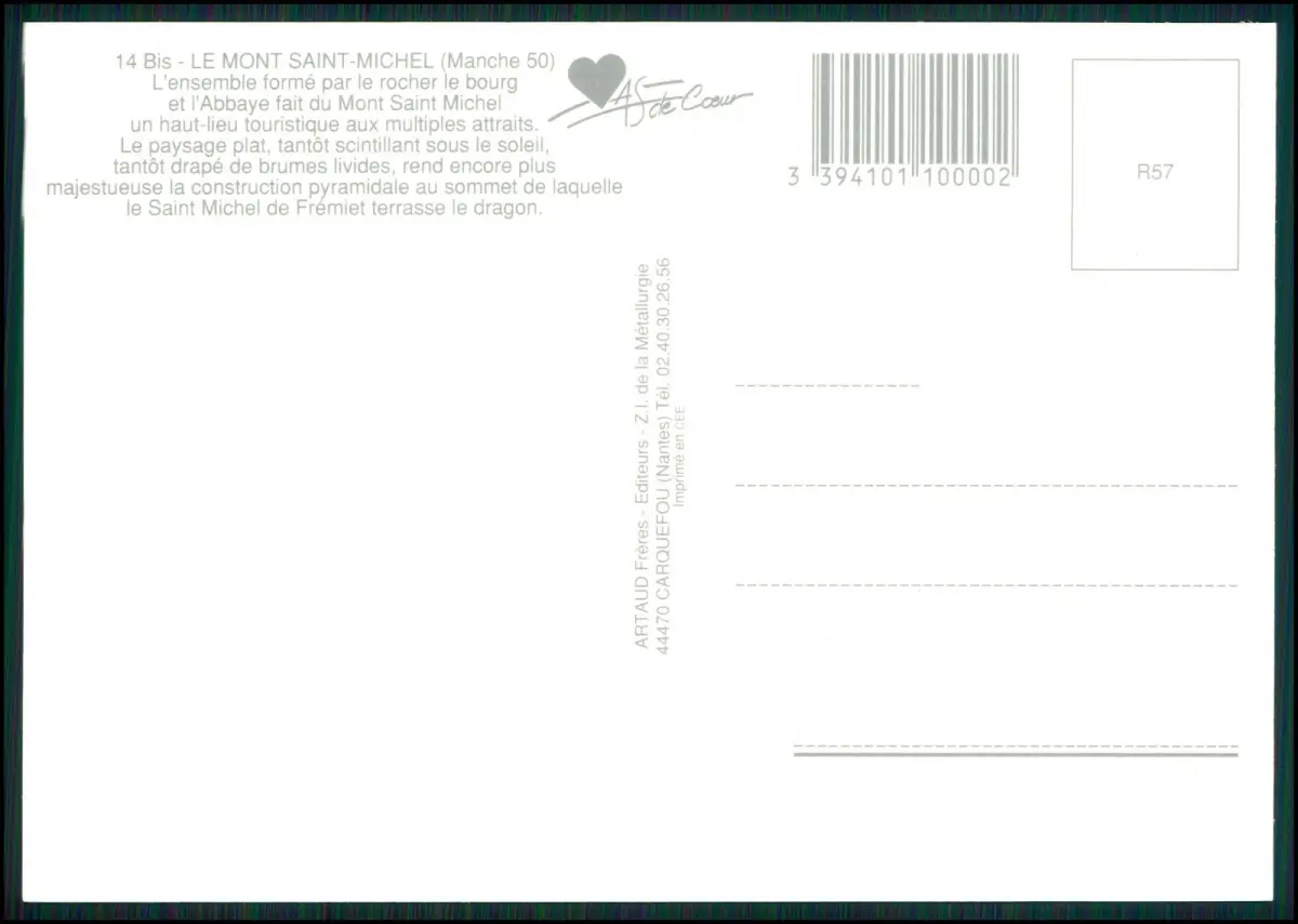 Wunderschöne Luftaufnahme des Mont-Saint-Michel, einem der berühmtesten Orte Frankreichs. Die farbkräftige AK zeigt die mittelalterliche Abtei und die befestigte Stadtanlage bei Ebbe in beeindruckender Gesamtansicht – eingerahmt von Meer, Watt und endloser Weite.