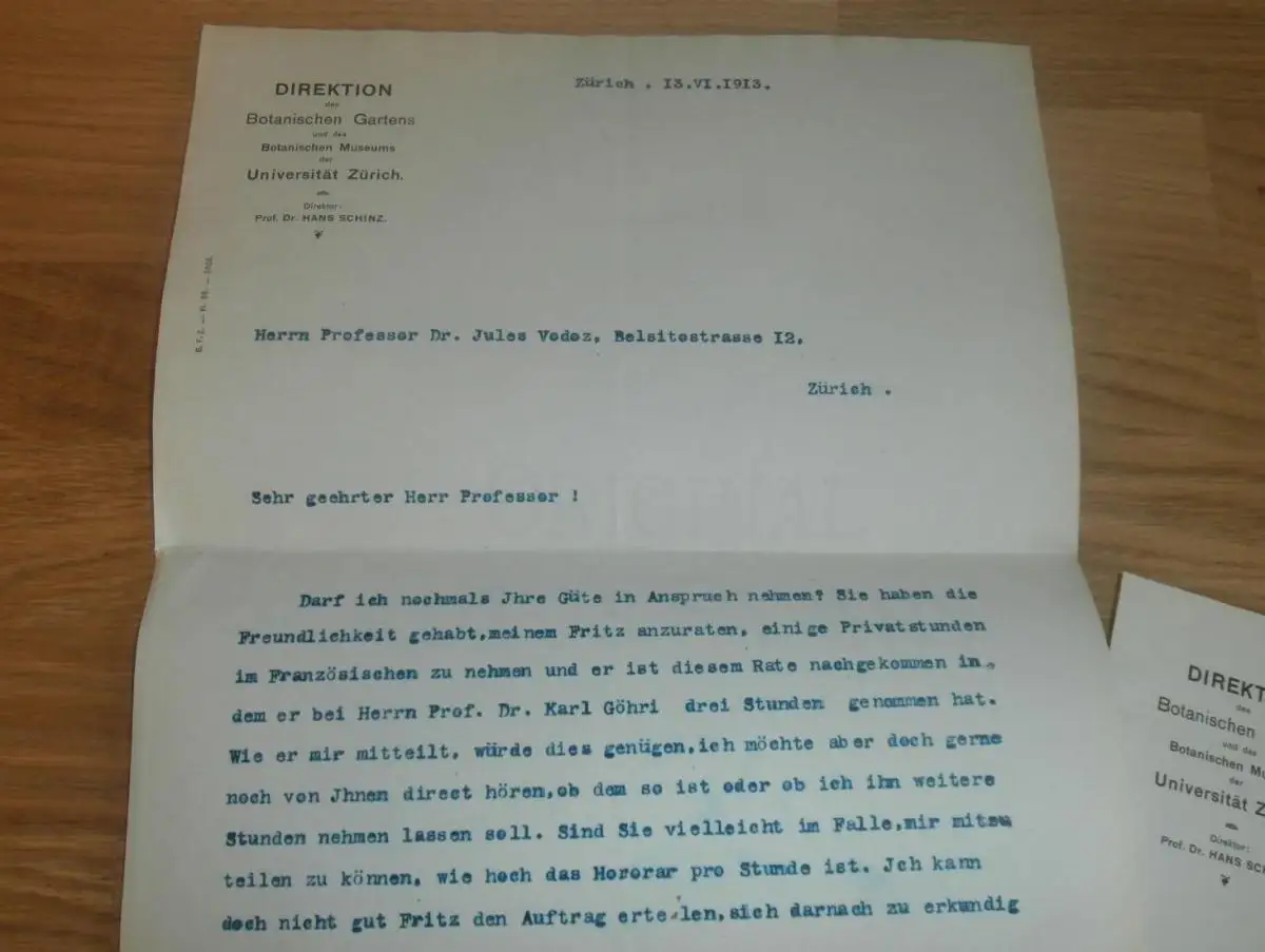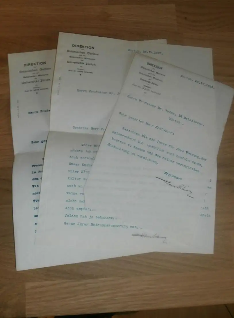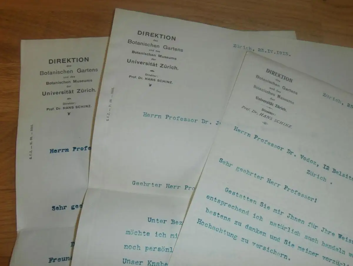 3x Briefe Prof. Dr. Hans Schinz an Dr. Vodoz , 1913 , Botanischer Garten und Museum Zürich , mit Autograph !!!