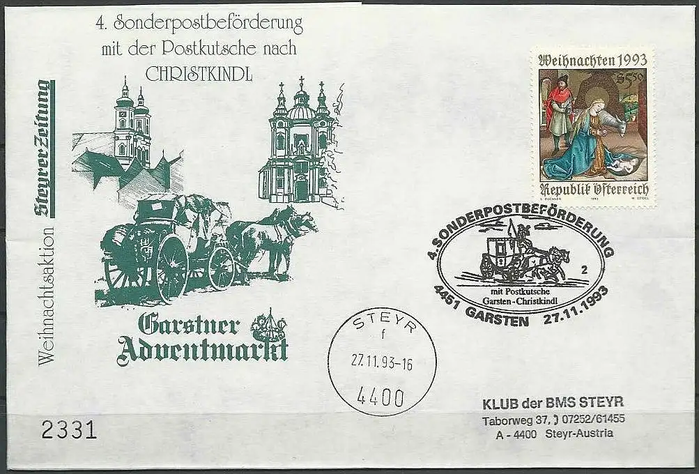 4. Sonderpostbeförderung mit der Postkutsche nach Christkindl 1993 - Faltbrief - Garstner Adventmarkt