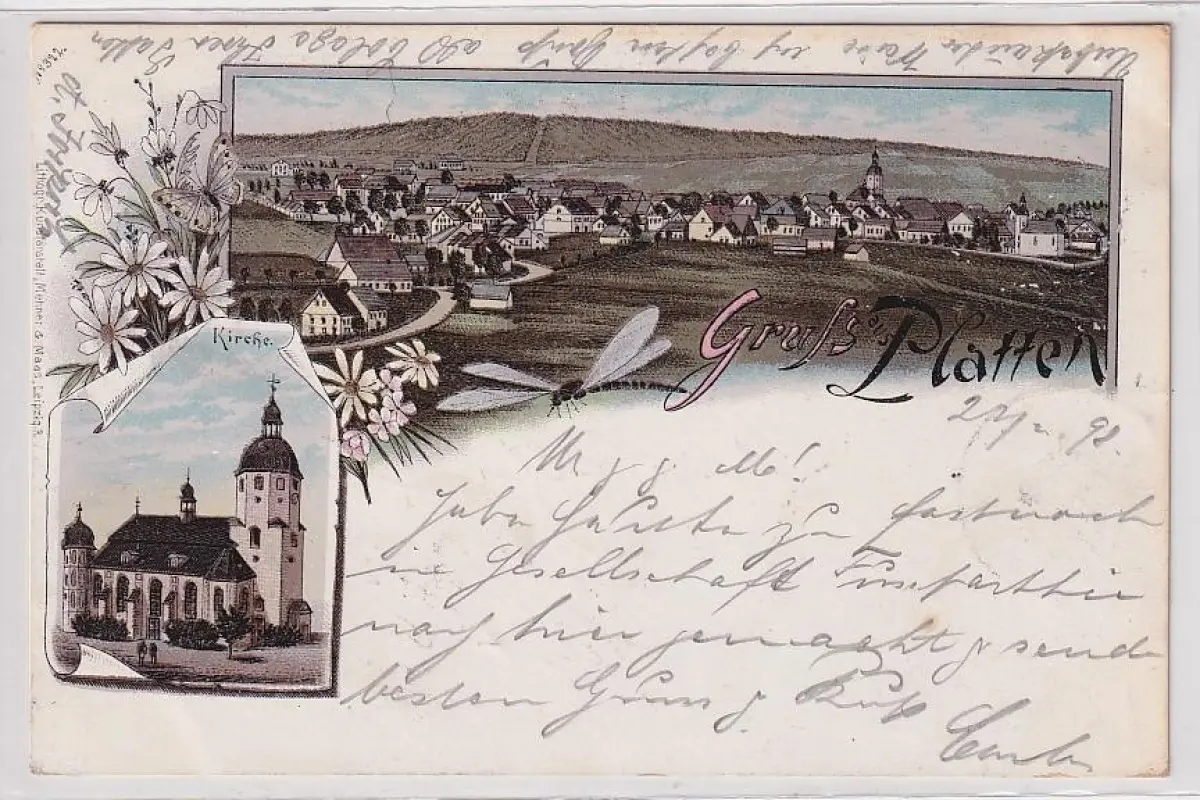 49253 Ak Lithographie Gruss aus Platten Totalansicht und Kirche 1898