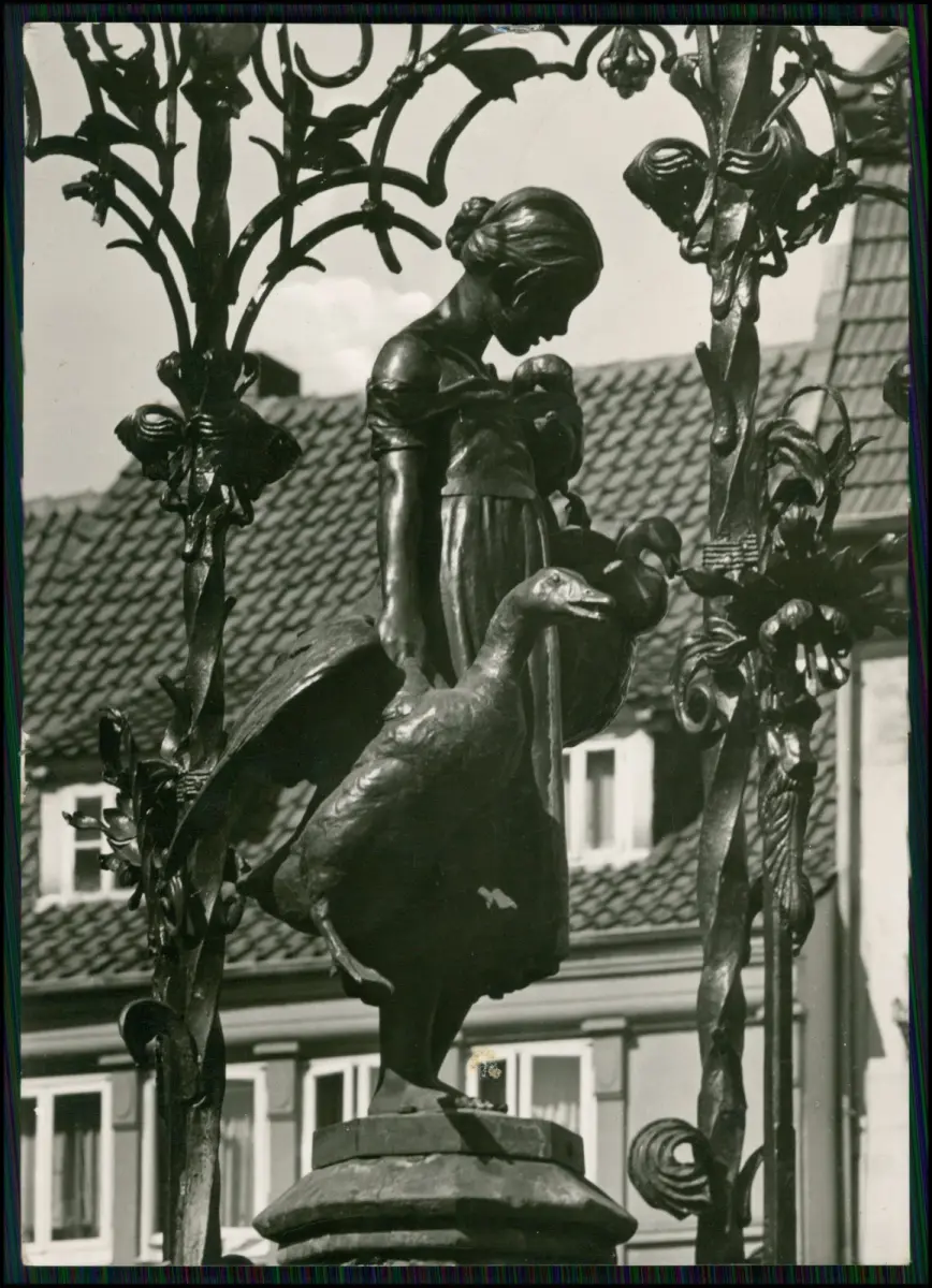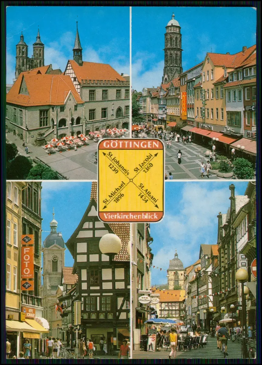 Göttingen – historische Innenstadt mit eindrucksvollem Ensemble aus dem Marktbrunnen mit Gänseliesel, der als das „meistgeküsste Mädchen der Welt“ gilt (Stadtwahrzeichen), dem Vierkirchenblick mit Blick auf die Kirchen St. Johannis, St. Jacobi, St. Michael und St. Albani, sowie städtischem Fachwerk und Alltagsszenen der 1960er/1970er Jahre.