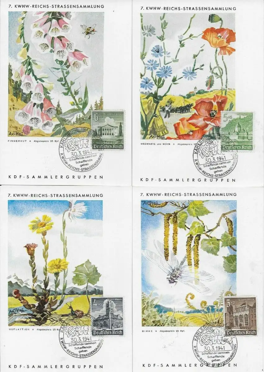 4x cartes du groupe de collection KDF: 7ème WHW de guerre avec le timbre spécial Karlsruhe