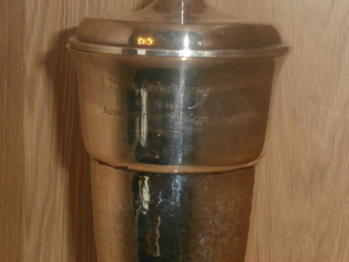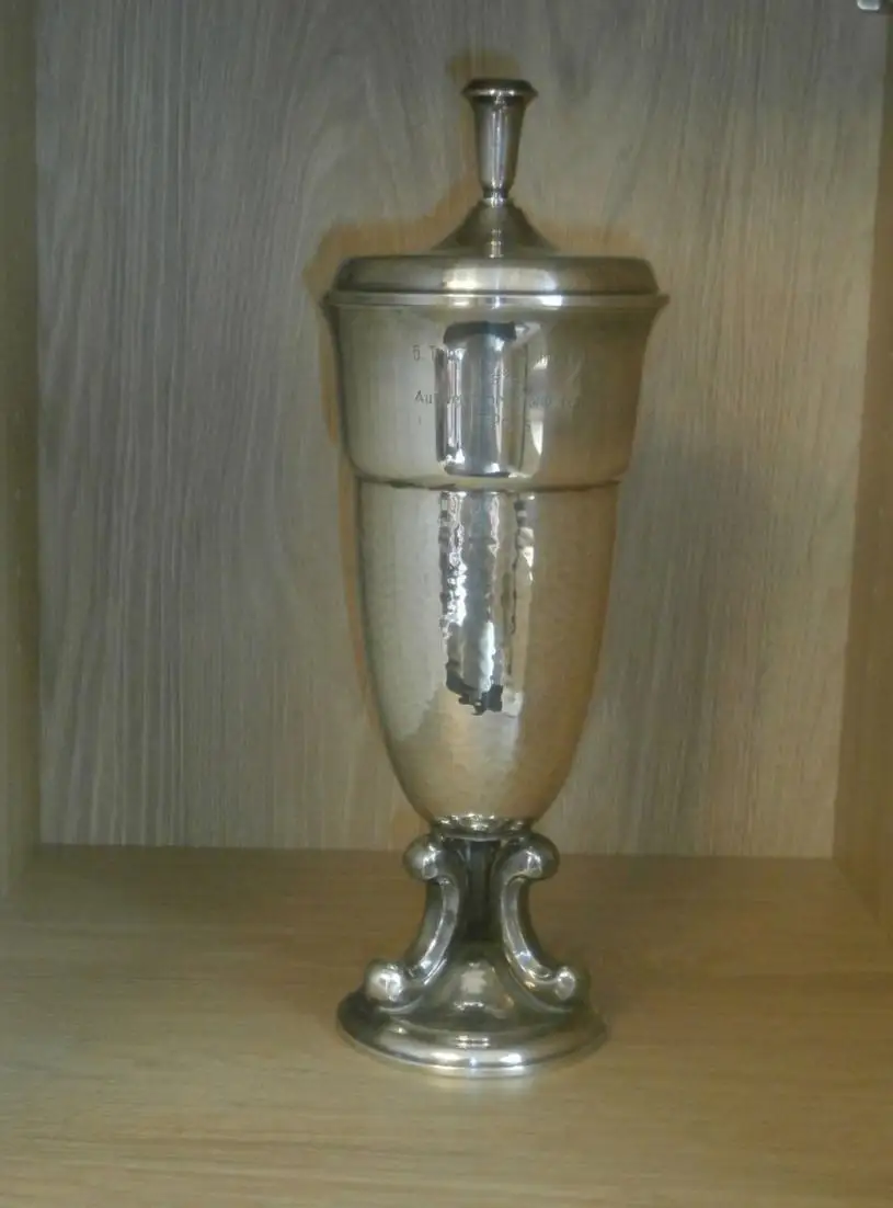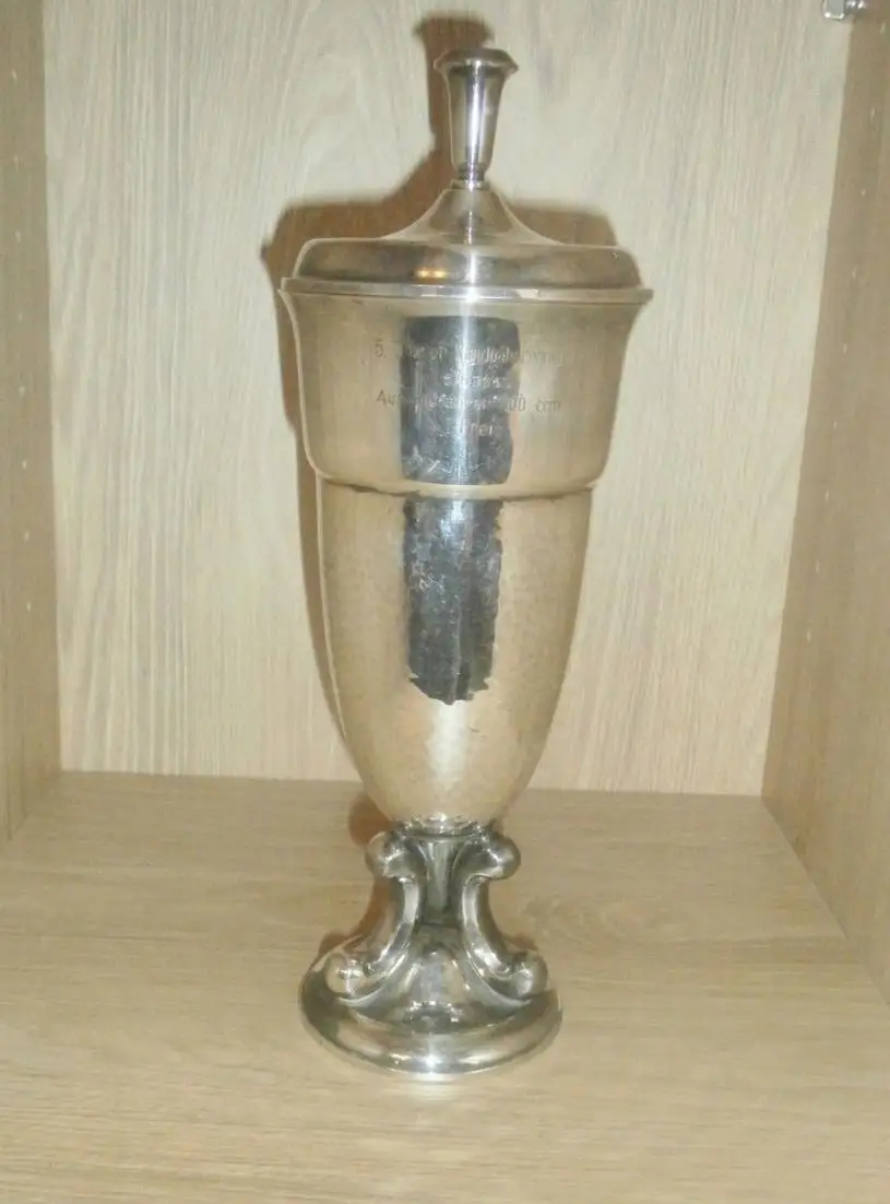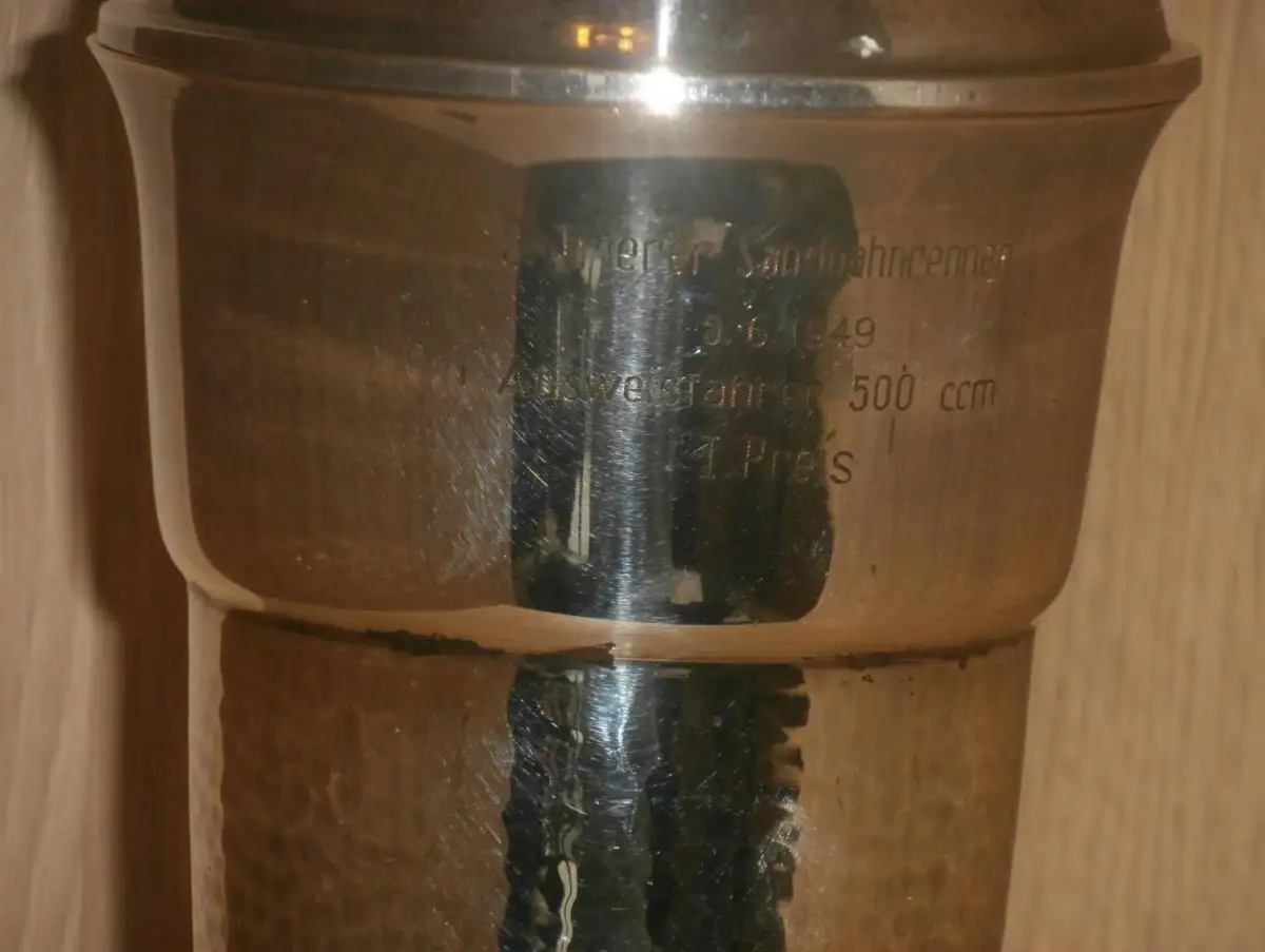 Silberpokal mit Aufschrift " 5. Trierer Sandbahnrennen - 5.6.1949 - Ausweisfahrer 500ccm - I. Preis "