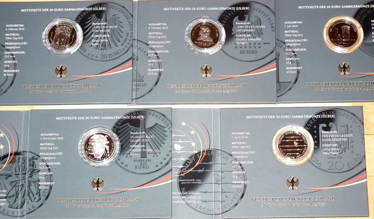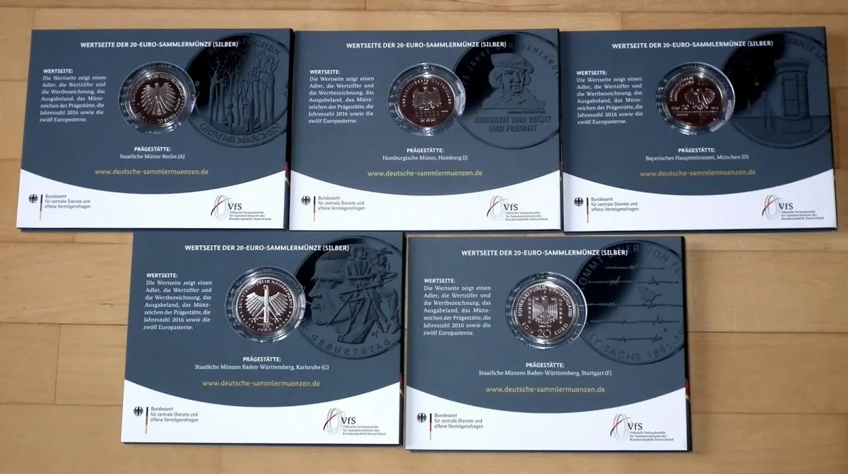 5 x 20 Euro 2016 Gedenkmünzen Komplett A, D, F, G, J Spiegelglanz PP im Blister