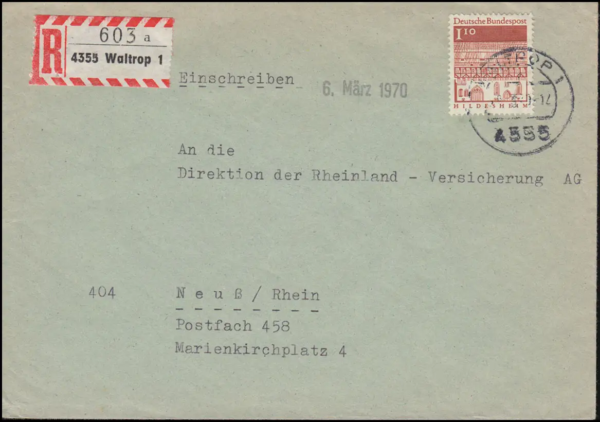 à la direction de l'assurance Rhénanie avec date d'entrée / date de dépôt 6 mars 1970 N° de catalogue: 501 Examen: original Référence produit: 00000000033114