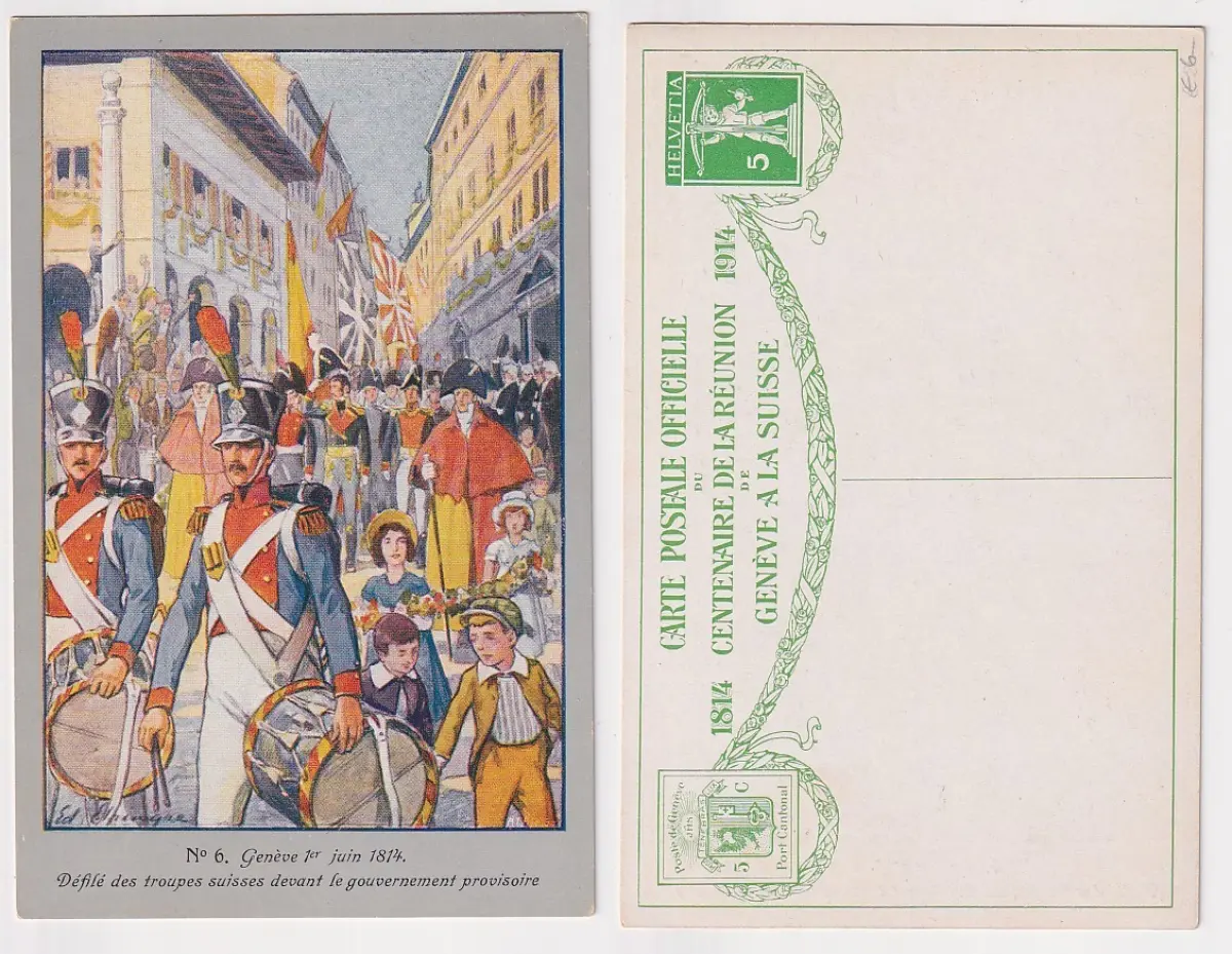 Offizielle Postkarte Nr. 6 zum 100. Jahrestag der Wiedervereinigung Genfs mit der Schweiz: Défilé der Schweizertruppen ungelaufen gute Erhaltung, siehe Bild