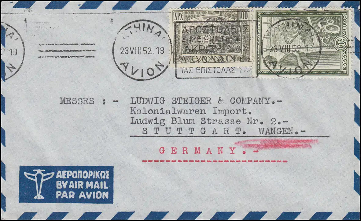 552 Monastère de Johannes + 585 Reconstruction sur lettre ATHEN 238.1952 à Stuttgart
