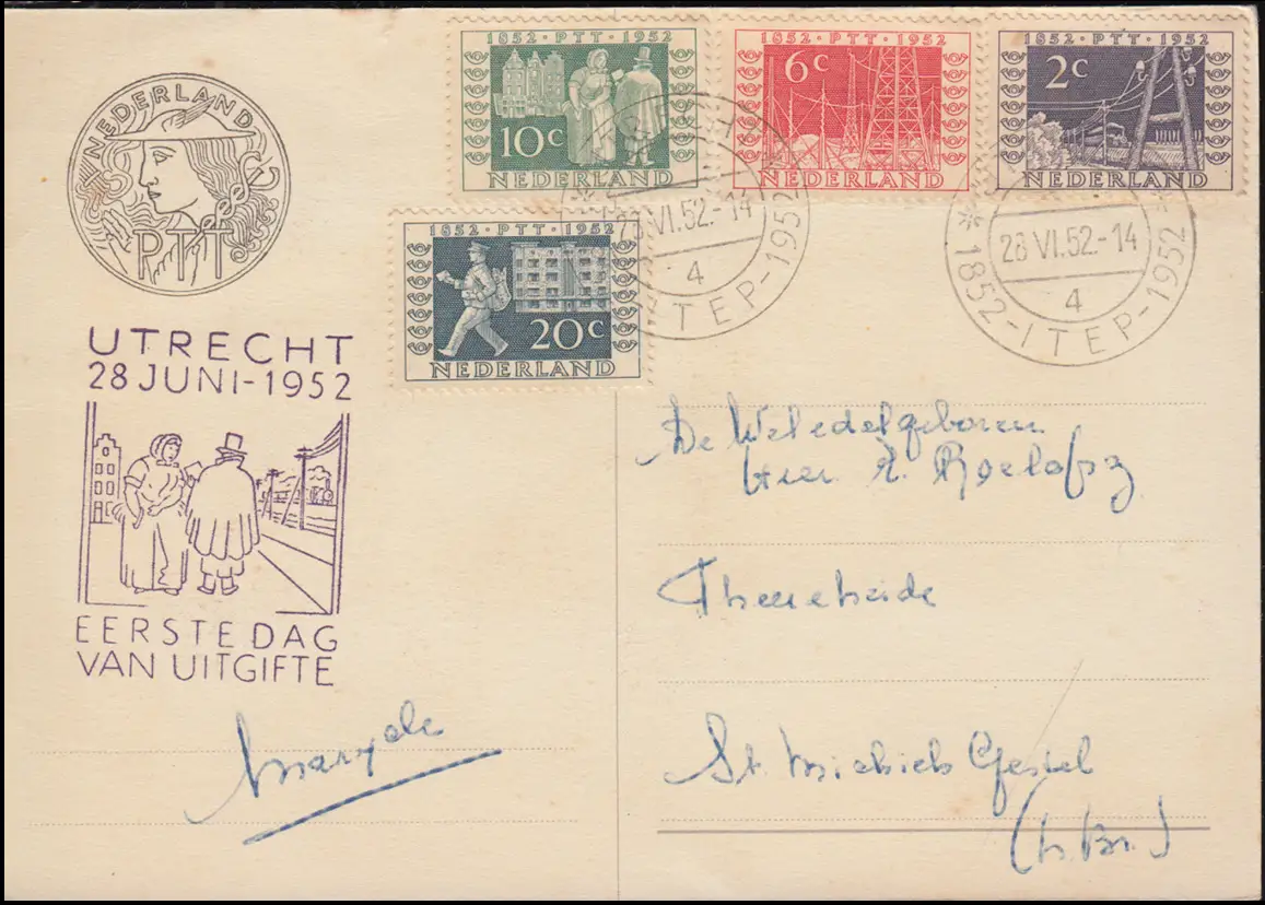Carte postale "ITEP 1852-1952" - Exposition internationale 100 ans Timbres à Utrecht 1952 Numéro de catalogue: 593-596 Examen: original Référence produit: 00000000033195