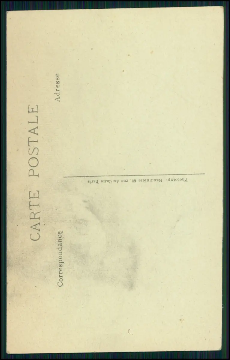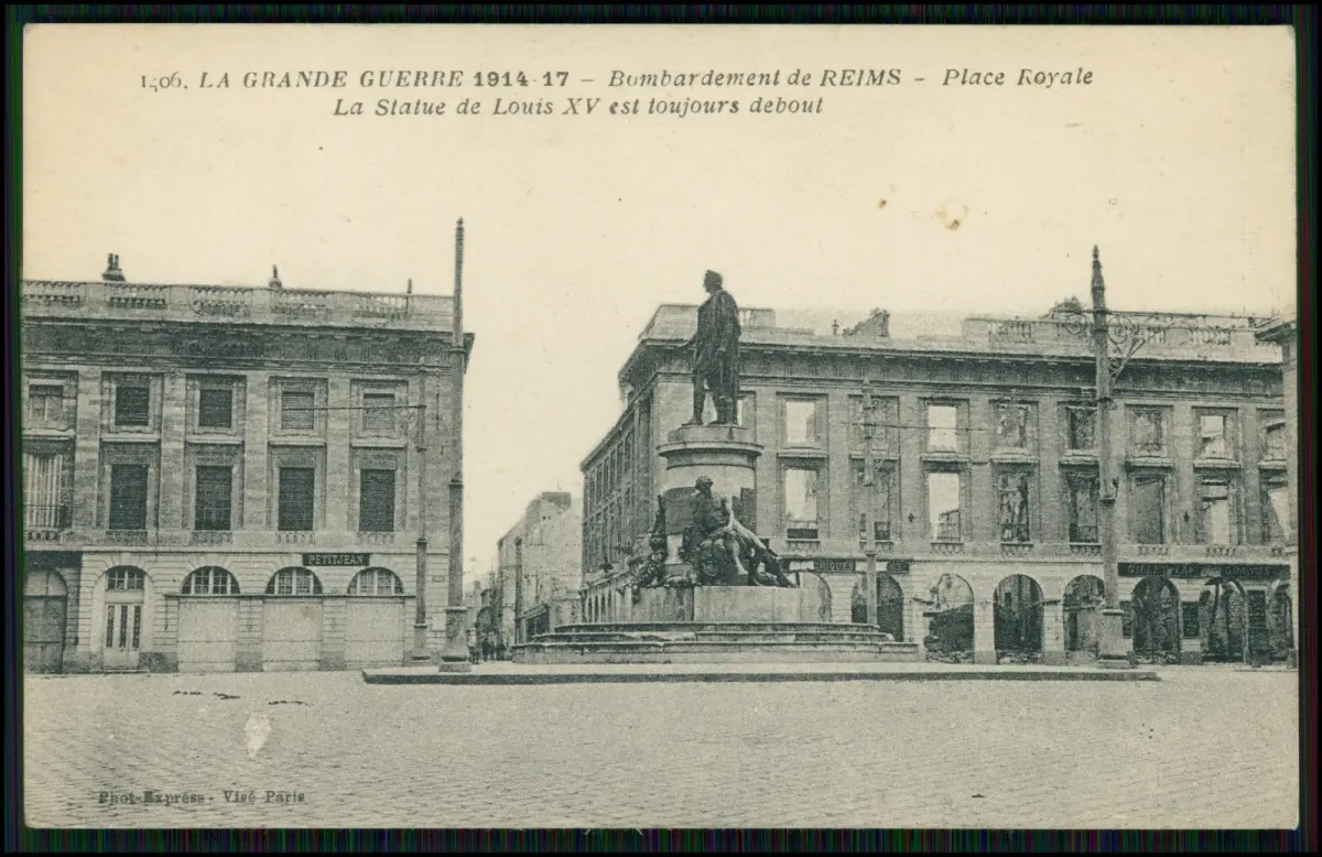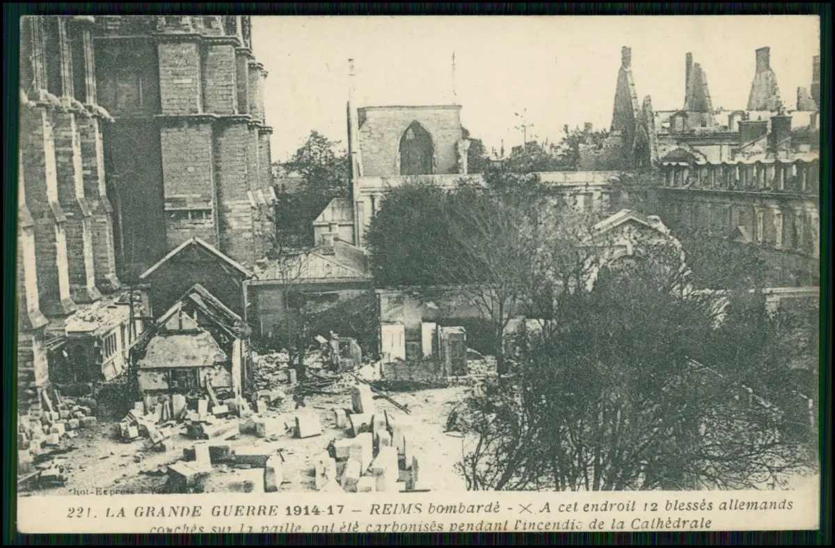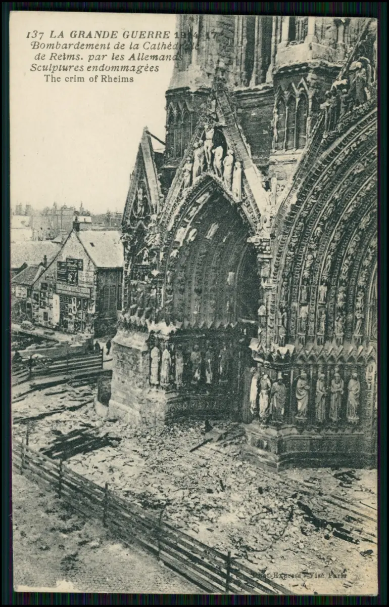 Beschriftung oben: “La Grande Guerre 1914–17 – Bombardement de la Cathédrale de Reims par les Allemands – Sculptures endommagées.”