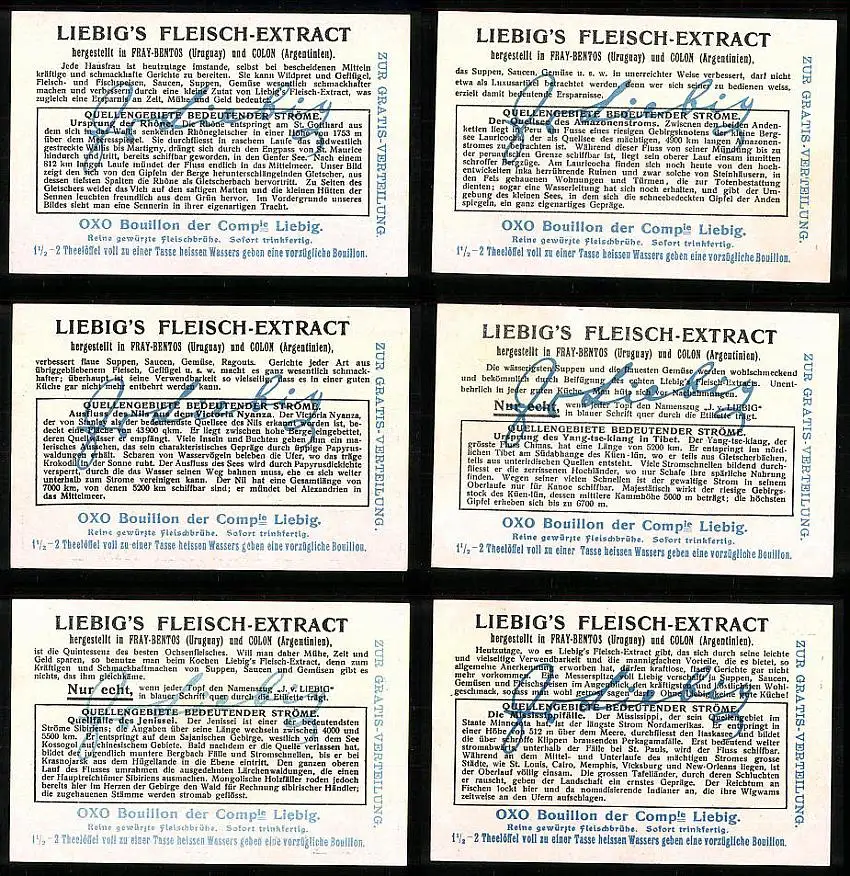 6 Sammelbilder Liebig, Serie Nr. 945: Quellengebiete bedeutender Ströme, Mississippi, Nil, Amazonas, Rhone