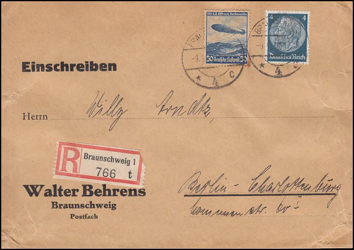 Lettre recommandée de 20 grammes de la société Behrens in Braunschweig comme armoire mixte porto approprié selon BERLIN-CHARLOTTENBURG 10.4.36 Numéro de catalogue: 606+514 Vérification: original Référence produit: 00000000044363