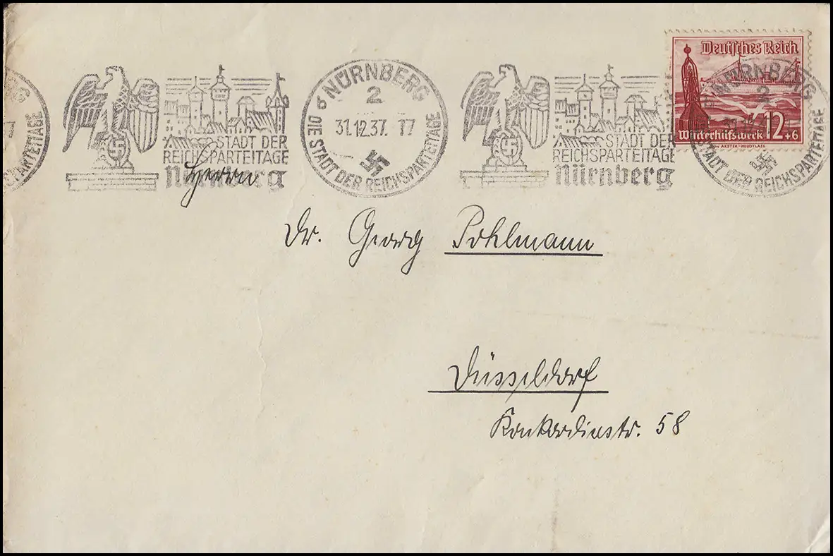 656 navires WHW EF sur lettre timbre publicitaire NÜRNBERG Parti du Reich 21.12.37