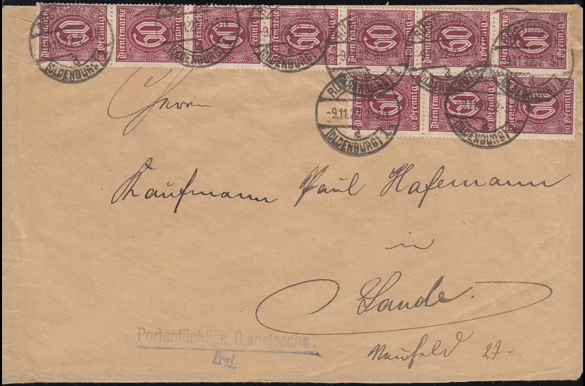 Affaire de service à payer par le tribunal de l'Oldenburg à Rüstingen comme lettre de porto juste dans le trafic longue distance vers Sande. - Frankatur a été collée à peine selon le graphique Numéro de catalogue: D66 Examen: original Référence produit: 00000000027749>Remarque: Cet article n'est disponible qu'une seule fois. Vous recevrez exactement l 'article représenté.