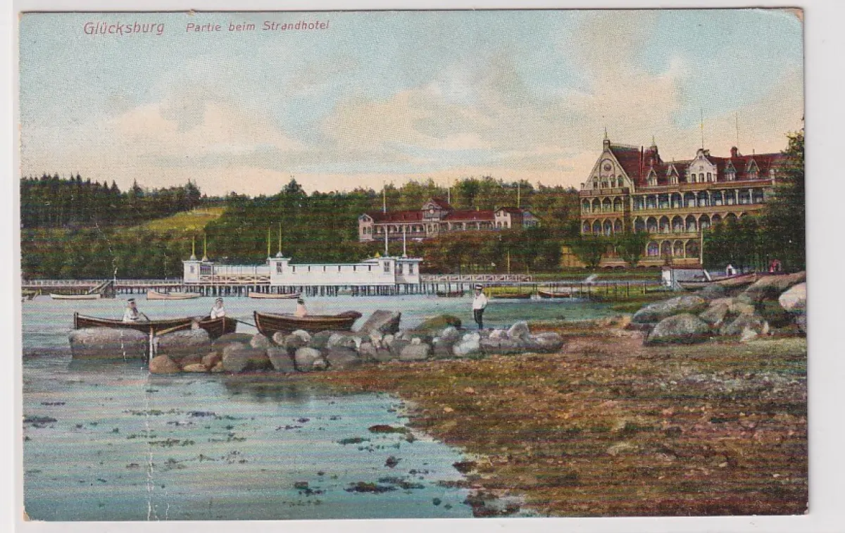 906860 Soldatenpost Ak Glücksburg - Partie beim Strandhotel mit Booten 1915