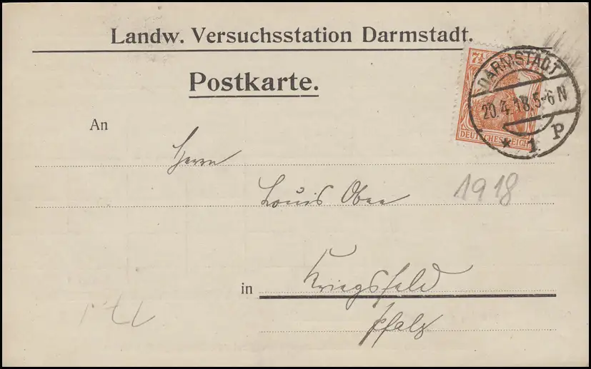99 Germania EF Carte postale Landw. Station expérimentale DARMSTADT 20.4.18 n. Kriegerfeld