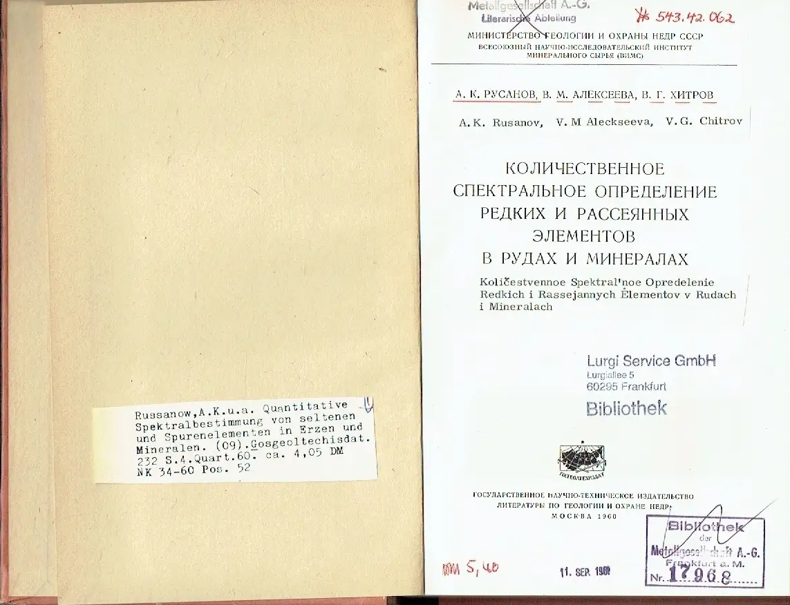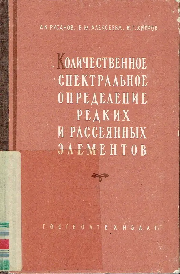 A. K. Rusanov V. M. Alekseyeva V. G. Khitrov: Kolichestvennoye Spektral'noye Opredeleniye Redkikh i Rasseyannykh Elementov v Rudakh i Mineralakh.