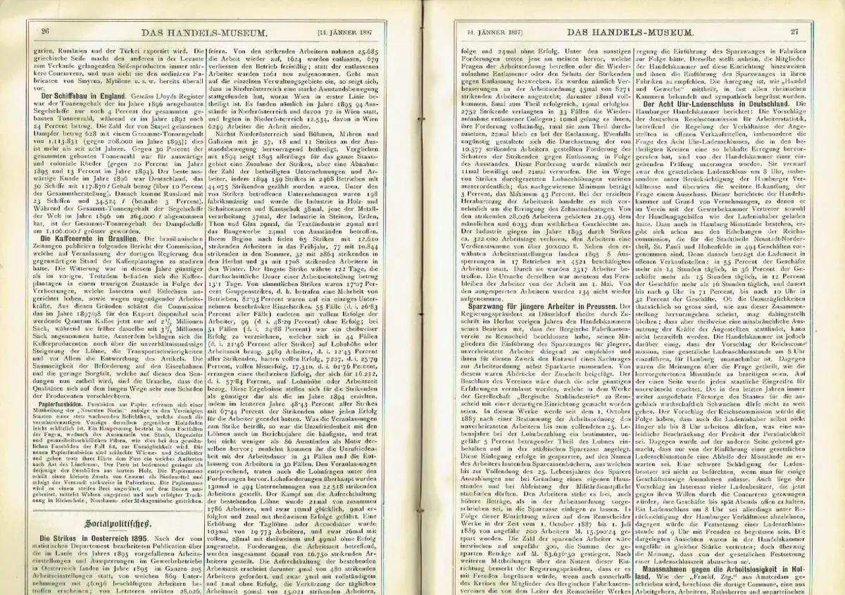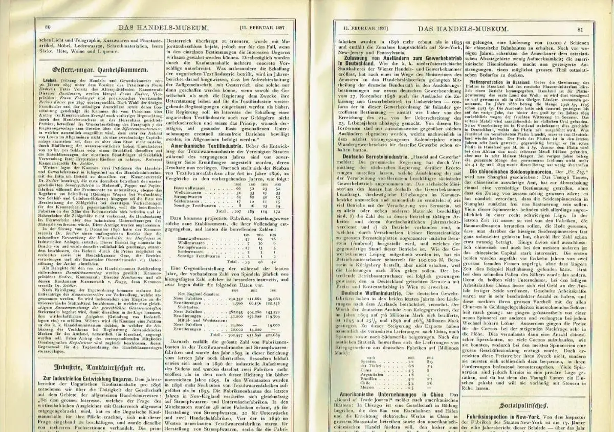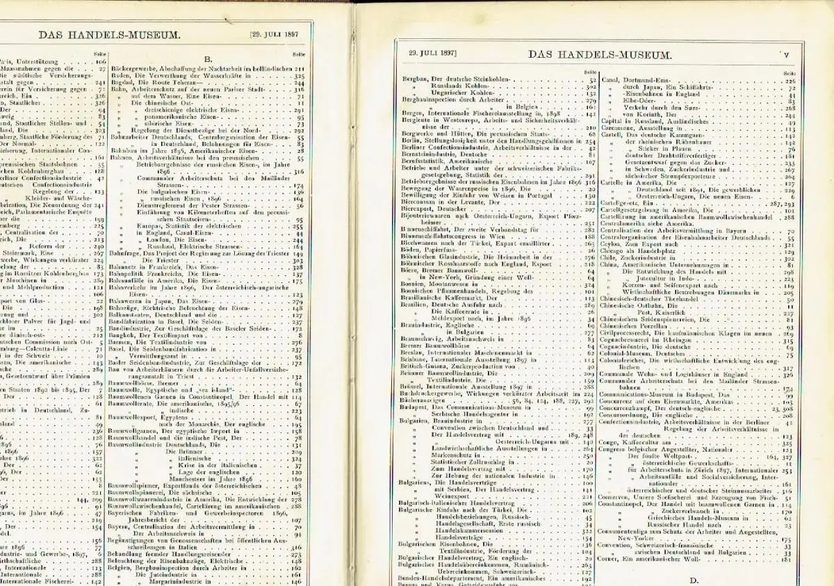guter bis sehr guter Zustand, geringe Gebrauchs- und Alterungsspuren: Einbandecken und -kanten teils gering abgenutzt - Seitenschnitt gebräunt - Papier teils etwas vergilbt, aber Seiten sauber und ordentlich - Titel und nachfolgende Seite oben mit kleinem Insektenfraßloch, als Beispiel hier der Inhalt der ersten 3 Hefte: - Die Arbeitslosen im Deutschen Reiche - Handels-Museum: Entsendung einer deutschen Commission nach Ostasien - Zollgesetzgebung: Oesterreich-Ungarn - Cartellwesen: Die neuen Eisencartelle in Oesterreich-Ungarn - Ausstellungen: Die Leipziger Industrie-und Gewerbeausstellung 1897     - Elektrische Ausstellung 1897 in Newcastle upon Tyne - Handel: - Zum Glasexport nach dem Orient - Der Ausfuhrhandel der europäischen Staaten 1890 bis 1895 - Die Entwicklung des Handels in der Mandschurei - Japans Aussenhandel - Der Textilienimport von Bangkok - Oesterr.-ungar. Handelskammern: Brünn - Industrie, Landwirtschaft etc.: - Die Fahrrädererzeugung in Steiermark - Die Förderung der heimischen Porzellanindustrie - Der inländische Flachsconsum - Aufschwung der Handweberei in der Schweiz - Sozialpolitisches: Der österreichische Gewerkschaftscongress - Communicationsmittel, Schifffahrt etc.: Die chinesische Ostbahn - Lieferungs-Ausschreibungen, Concurrenzen etc.: Serbien - Handels-Museum: Französisches Musterlager in Belgrad - Philadelphias Handels-Museum - Zollgesetzgebung: - Frankreich - Vereinigte Staaten von Amerika - Handelspolitisches: - Ein englisch-bulgarischer Handelsvertrag - Statistischer Zollzuschlag in Bulgarien - Die Tariffrage in Amerika - Handel: - Die Bewegung der Waarenpreise in 1896 - Die Registrirung der Handelsfirmen - Zuckerimport in der Schweiz - Export von Glasarmbändern nach Indien - Porzellanwarenexport nach Amerika - Der deutsch-englische Concurrenzkampf - Der Import landwirthschaftlicher Maschinen in Rumänien - Russischer Handel nach Constantinopel - Export amerikanischer Fabricate nach England - Oesterr.-ungar. Handelskammern: - Feldkirch - Salzburg - Industrie, Landwirtschaft etc.: - Die englische Kunstindustrie - Versuche im Arsenale zur Gewinnung rauchloser Pulver für Jagd- und Luxusgewehre - Die russische Fabriksindustrie - Die Seifenfabrication in Griechenland - Der Schiffsbau in England - Die Kaffeeernte in Brasilien - Papierfussböden - Socialpolitisches: - Die Strikes in Oesterreich 1895 - Sparzwang für jüngere Arbeiter in Preussen - Der Acht Uhr-Ladenschluss in Deutschland - Massnahmen gegen die Arbeitslosigkeit in Holland - Englisches Gesetz über Strafabzüge der Handelsangestellten - Communicationsmittel, Schifffahrt etc.: - Die englisch-ostindische Post - Amerikanischer Eisenbahnbau im Jahre 1896 - Lieferungs-Ausschreibungen, Concurrenzen etc.: - Rumänien - Serbien - Die mitteleuropäische Zollunion - Handels-Museum: - Japanische Industrieexperten in Europa - Die rumänischen Handelskammern - Zollgesetzgebung: - Brasilien - Britisch-Indien - Dänemark - Russland - Schweiz - Vereinigte Staaten von Amerika - Handelspolitisches: - Convention zwischen Deutschland und Bulgarien - Neuer Zolltarif in Dänemark - Schweizerisch-französische Convention - Cartellwesen: Productionseinschränkung der oberelsässischen Kammgarnspinner - Ausstellungen: Landwirtschaftliche Wanderausstellung in Hamburg - Handel: - Unser Handel mit Britisch-Indien - Mehlexport nach Brasilien im Jahre 1896 - Erste russisch-bulgarische Handelsgesellschaft - Amerikas Warenimport - Die Korinthenausfuhr aus Griechenland - Amerikanischer Trockenobsthandel - Die Entwicklung des Fleischhandels der Colonie Queensland - Zollreclamationen in Amerika - Industrie, Landwirthschaft etc.: - Die französische Textilindustrie - Die Krise in der italienischen Baumwollindustrie - Eine holländische Presshefefabrik - Die Glas- und keramische Industrie in Russland - Die amerikanische Margarineindustrie - Die amerikanische Rohrzuckerindustrie - Zuckerproduction von Britisch-Guiana - Kautschuk in Kamerun - Socialpolitisches: - Die englischen Gewerkschaften - Zur Organisation des Handwerkes in Deutschland - Gewerkschaftliche Arbeitslosenunterstützung in Frankreich - Städtische Arbeitersecretariate in Deutschland - Der zweite internationale Genossenschaftscongress zu Paris - Bergarbeiterverhältnisse in Preussen - Arbeitsverhältnisse in der Berliner Confectionsindustrie - Genossenschaftlicher Betrieb in Deutschland - Communicationsmittel, Schifffahrt etc: - Die rumänische Handelsflotte - Canal-Eisenbahnen in England - Lieferungs-Ausschreibungen, Concurrenzen etc.   - Rumänien - Spanien, Halbleinen, ca. 21,5 x 32, 552 Seiten mit 11 Seiten Register