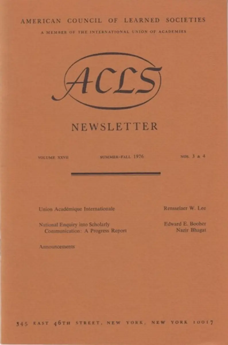Titel: ACLS Newsletter. Volume XXVII, summer-fall 1976, nos 3 & 4: Rensselaer W. Lee - Union Academique Internationale / Edward E. Booher and Nazir Bhagat: National enquiry into scholarly communication / announcements