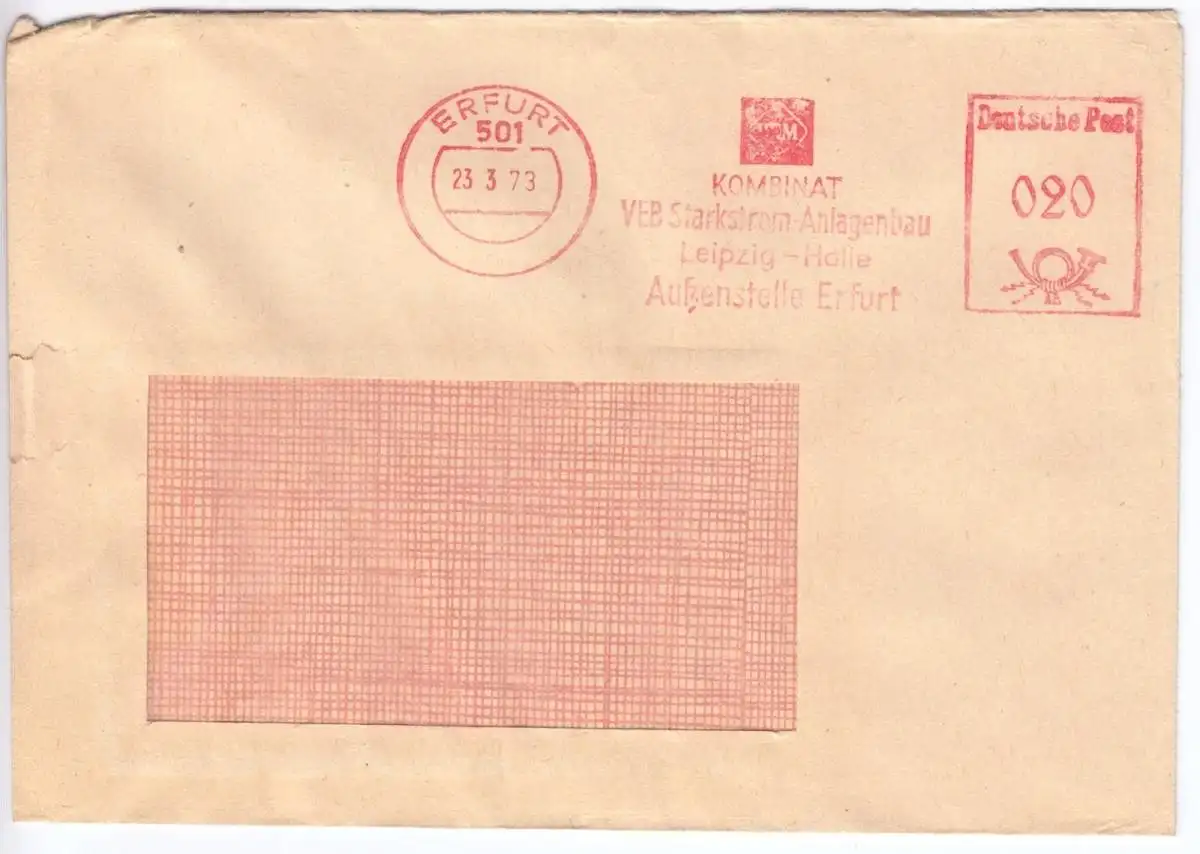 AbsenderfreistempelKombinat VEB Starkstrom-Anlagenbau Leipzig - Halle, Außenstelle Erfurt Abbildungen: Kombinatssignet Absender: Kombinat VEB Starkstrom-Anlagenbau Leipzig - Halle, Außenstelle Erfurt Empfänger: unbekannt, Fensterbrief Nebenstempel: keine Anmerkungen: rückseitig rauh geöffnet Im Inland erfolgt die Zusendung versandkostenfrei als Briefsendung der Deutschen Post AG oder eines privaten Postanbieters. Auslandsversand erfolgt über
