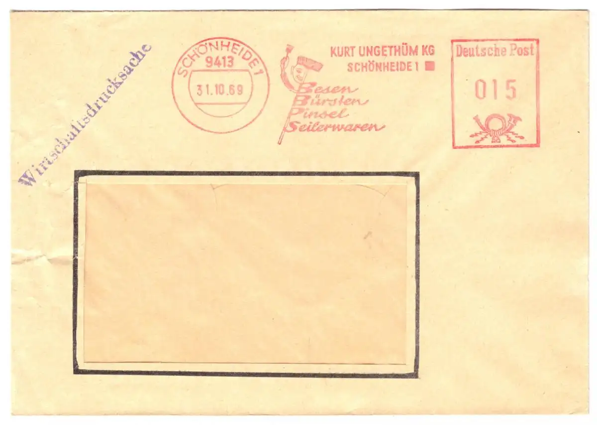 Absenderfreistempel Abbildungen: Besen Absender: Kurt Ungethüm KG, Besen, Bürsten, Pinsel, Seilerwaren Empfänger: unbekannt, Fensterbrief Nebenstempel: Wirtschaftsdrucksache Anmerkungen: keine Im Inland erfolgt die Zusendung versandkostenfrei als Briefsendung der Deutschen Post AG oder eines privaten Postanbieters. Auslandsversand