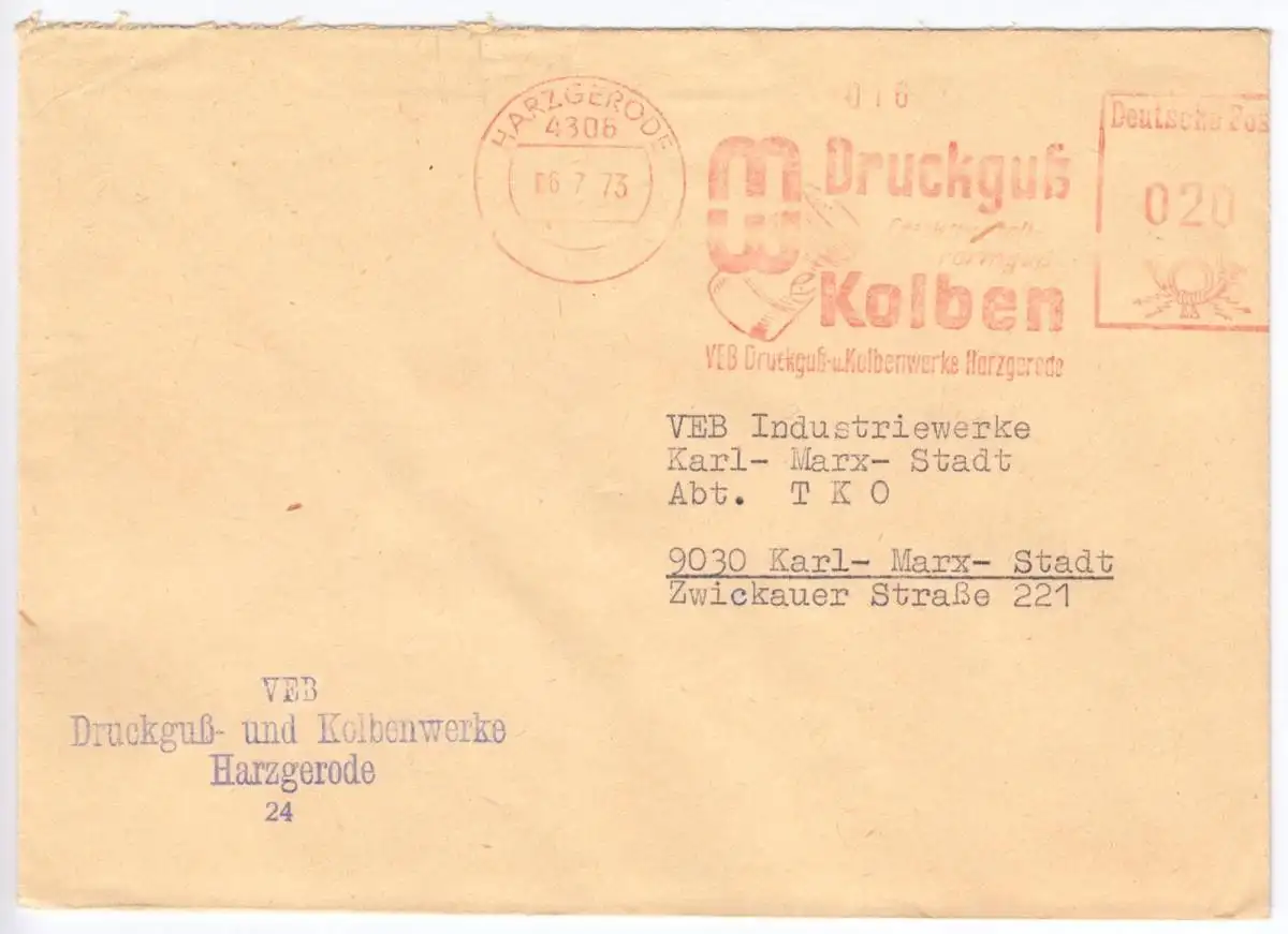 AbsenderfreistempelVEB Druckguß- und Kolbenwerke Harzgerode Abbildungen: Betriebssignet Absender: VEB Druckguß- und Kolbenwerke Harzgerode Empfänger: VEB INdustriewerke Karl-Marx-Stadt, Abt. TKO, 9030 Karl-Marx-Stadt, Zwickauer Str. 221 Nebenstempel: keine Anmerkungen: keine   Im Inland erfolgt die Zusendung versandkostenfrei als Briefsendung der Deutschen Post AG oder eines privaten Postanbieters.   Auslandsversand erfolgt über