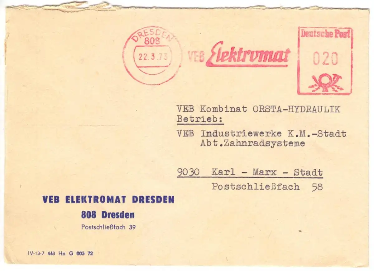 Absenderfreistempel Abbildungen: keine Absender: VEB Elektomat Dresden, 808 Dresden, PSF 39 Empfänger: VEB Kombinat Orsta-Hydraulik, Betrieb VEB Industiewerke K.-M.-Stadt, 9030 Karl-Marx-Stadt, PSF 58Porto: 020 Nebenstempel: keine Anmerkungen: etwas rauh geöffnet Im Inland erfolgt die Zusendung versandkostenfrei als Briefsendung der Deutschen Post AG oder eines privaten Postanbieters. Auslandsversand