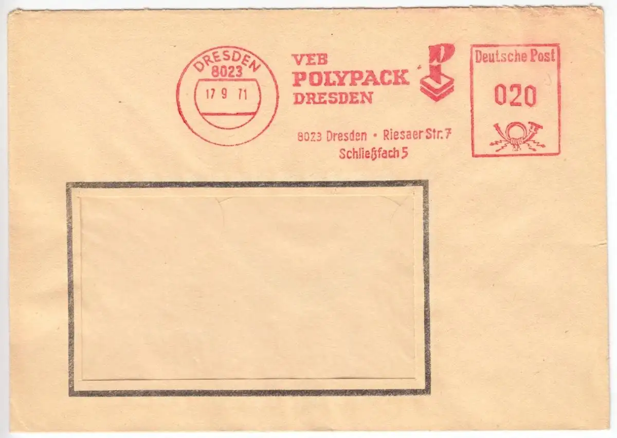 AbsenderfreistempelVEB Polypack Dresden, 8023 Dresden, Riesaer Str. 7, Schließfach 5 Abbildungen: Firmensignet Absender: VEB Polypack Dresden, 8023 Dresden, Riesaer Str. 7, Schließfach 5 Empfänger: unbekannt, Fensterbrief Nebenstempel: keine Anmerkungen: keine Im Inland erfolgt die Zusendung versandkostenfrei als Briefsendung der Deutschen Post AG oder eines privaten Postanbieters. Auslandsversand erfolgt über