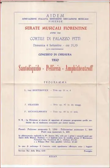 AIDEM Associazione italiana diffusione educazione musicale, Firenze: Concerto di chiusura Trio Santoliquido - Pelliccia - Amphitheatroff. - 1960, domenica 4 settembre, cortile di Palazzo Pitti, serate musicali Fiorentine. - Programma: Beethoven, Brahms, M