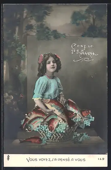 AK 1. April, Mädchen mit einem Korb voller Fische