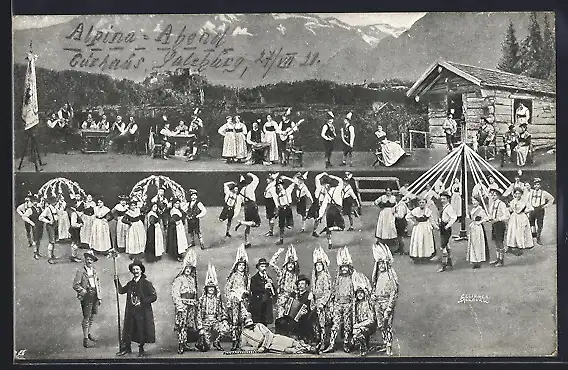AK 1. Salzburger Gebirgs-Verein Alpina, Menschen in Trachten tanzen