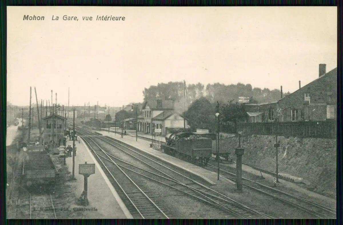 AK 1. WK Mohon Morbihan Frankreich, Blick auf den Bahnhof Lokomotive Gleisanlage