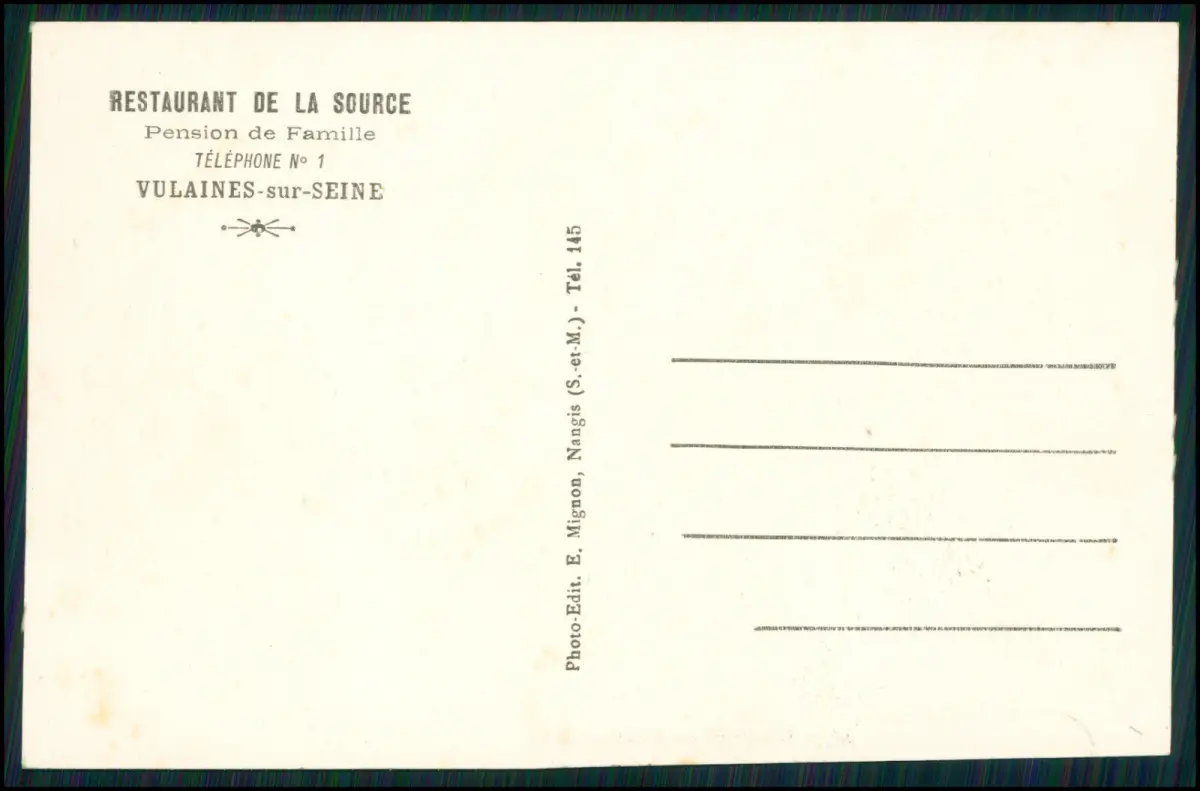 Unbeschrieben, Vermerk „Restaurant de la Source“ mit Telefonnummer 1 (!) – Hinweis auf eine historische Pension de Famille in Vulaines-sur-Seine.