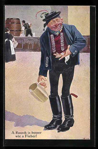 AK A Rausch is besser wie a Fieber!, Biertrinker in Tracht mit einem Bierkrug