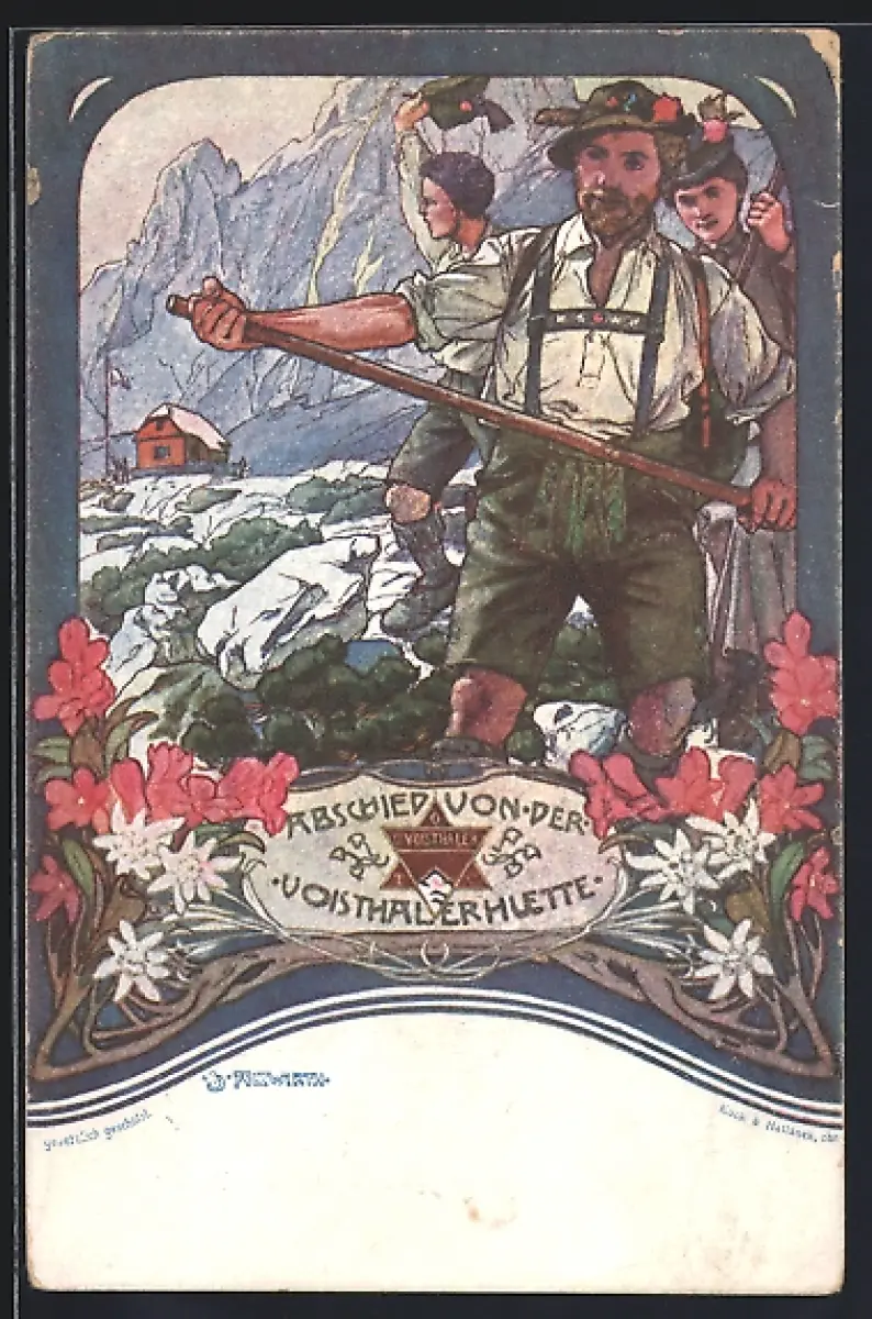 AK Abschied von der Voisthalerhütte, Bergbauern mit Blumen