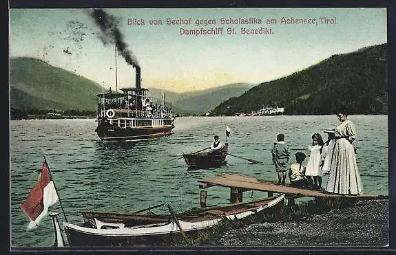 AK Achenkirch am Achensee, Blick von Seehof mit Dampfschiff St. Benedikt