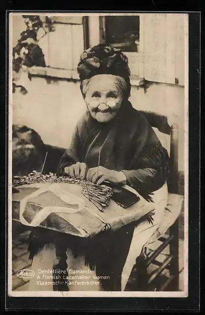 AK Ältere flämische Spitzenklöpplerin mit Brille bei der Arbeit