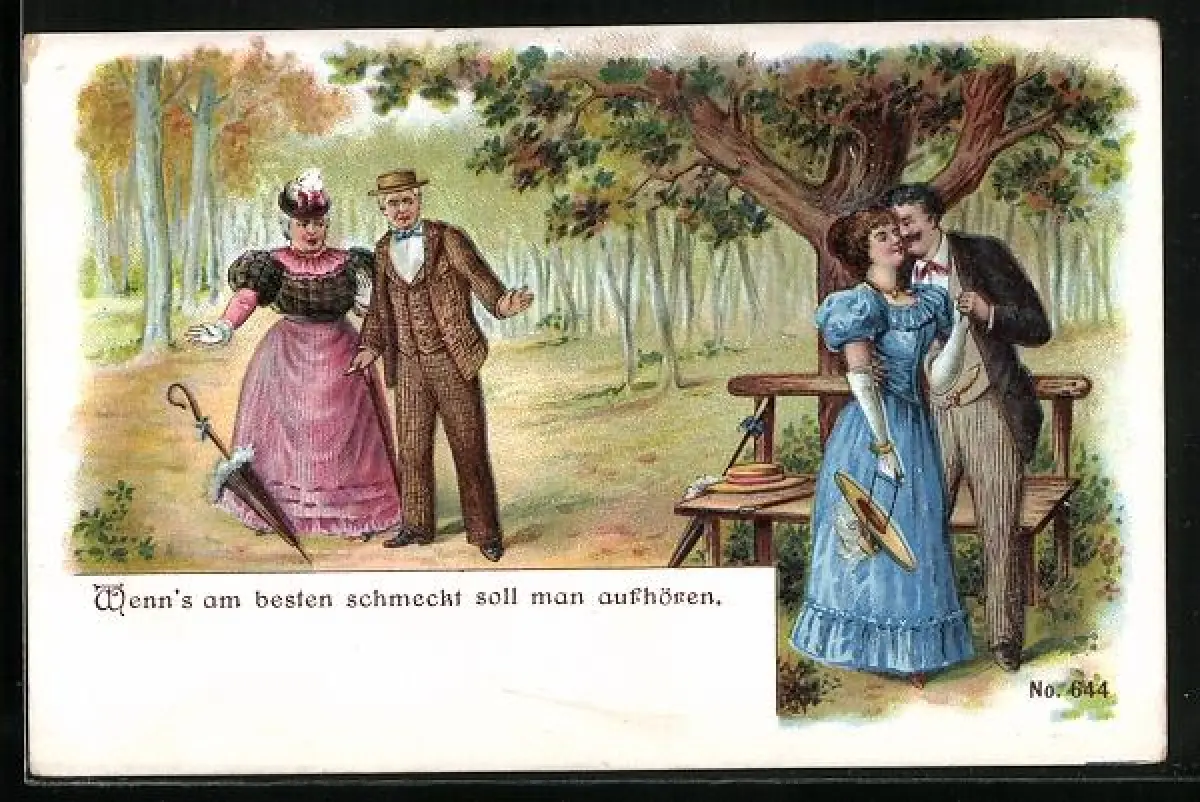 AK Älteres Paar mit Schirm entdeckt ein Liebespaar im Wald