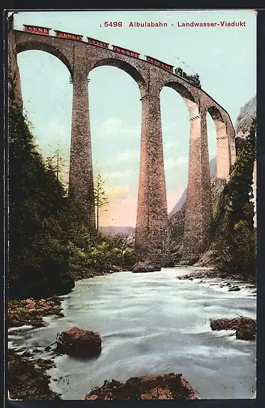 AK Albulabahn, Landwasser-Viadukt, Zug der Albulabahn auf dem Viadukt