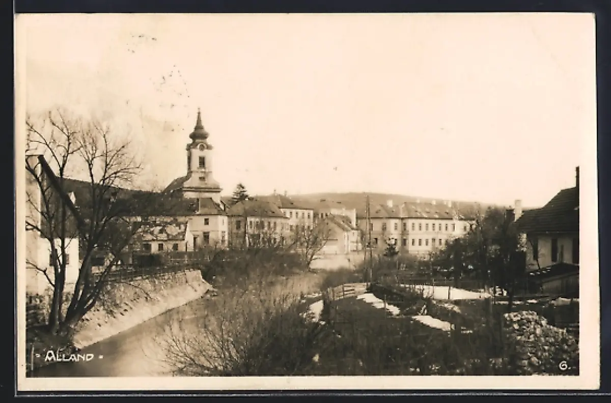 AK Alland, Ortspanorama mit Fluss im Winter aus der Vogelschau