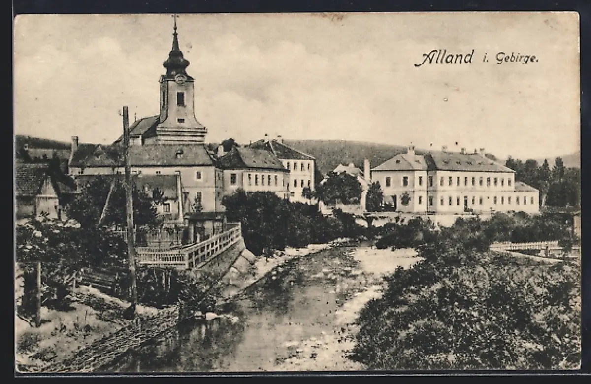 AK Alland, Teilansicht mit Kirche und Flusslauf