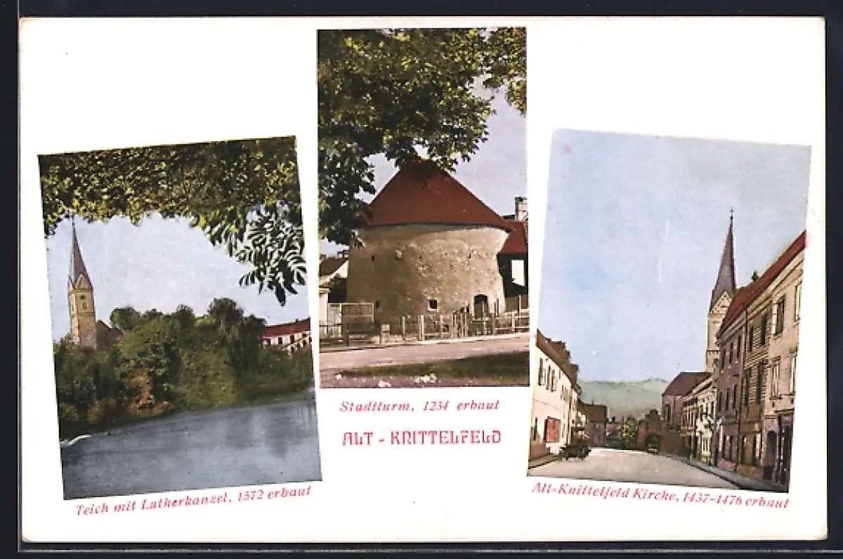 AK Alt-Knittelfeld, Stadtturm, Kirche, Teich mit Lutherkanzel