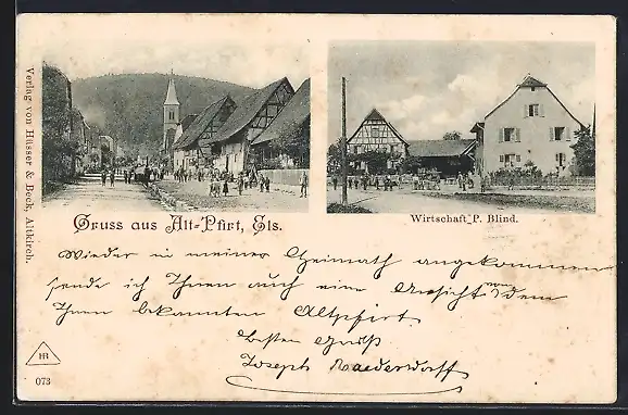 AK Alt-Pfirt, Gasthaus P. Blinf, Strassenpartie im Ort
