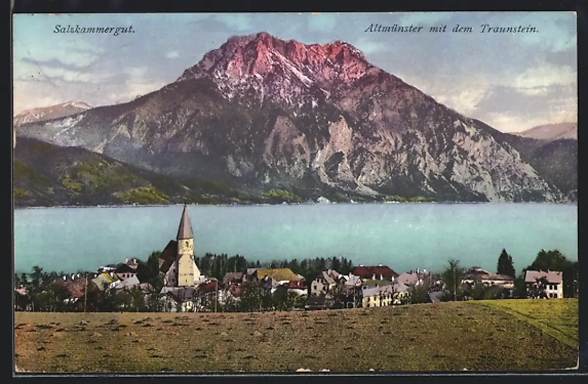 AK Altmünster, Ortpartie am Ufer mit Blick auf den Traunstein