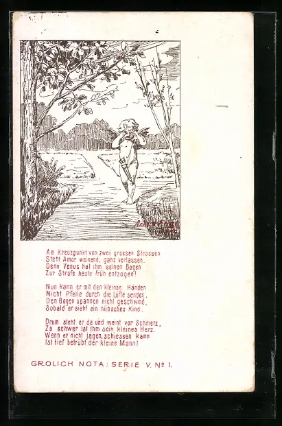 AK Amor steht weinend am Kreuzpunkt zweier grosser Strassen, Venus hat ihm den Bogen zur Strafe entzogen