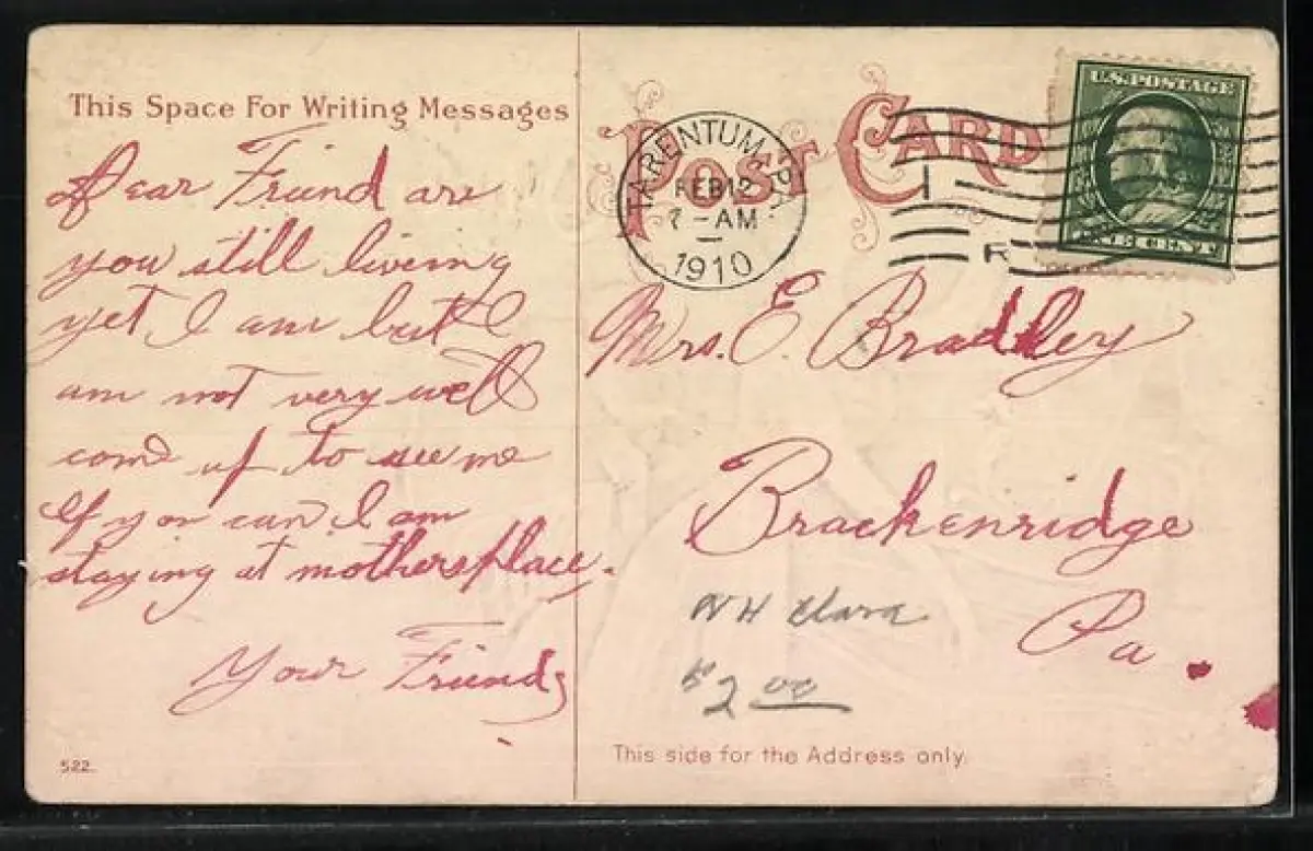 Personenbezogene Daten auf der Rückseite der Karte wurden durch blauen Textmarker unkenntlich gemacht. Die blauen Stellen sind auf die Vorderseite durchgeweicht und wirken sich negativ auf das Postkartenfoto aus