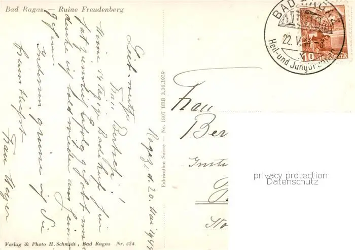 Bad_Ragaz_Ragatz_SG Ruine Freudenberg postalisch gelaufen 1944 Erhaltung siehe scans [FriedD77] Frierer