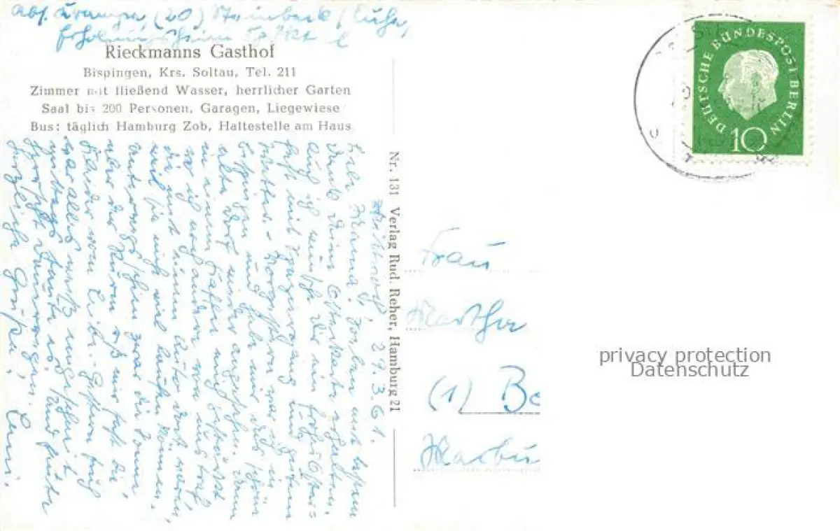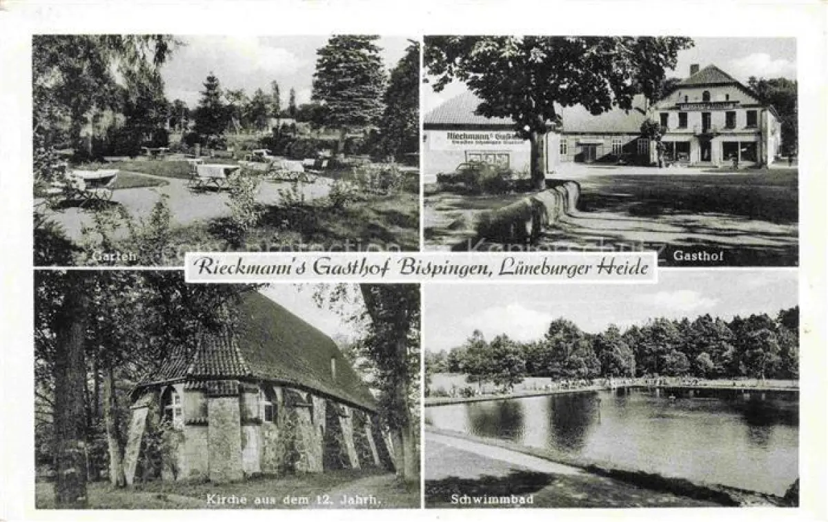 Bispingen Rieckmanns Gasthof Garten Kirche Schwimmbad postalisch gelaufen Erhaltung siehe scans [WerneD78] alte Postkarte Wern Katcode 11110003358002