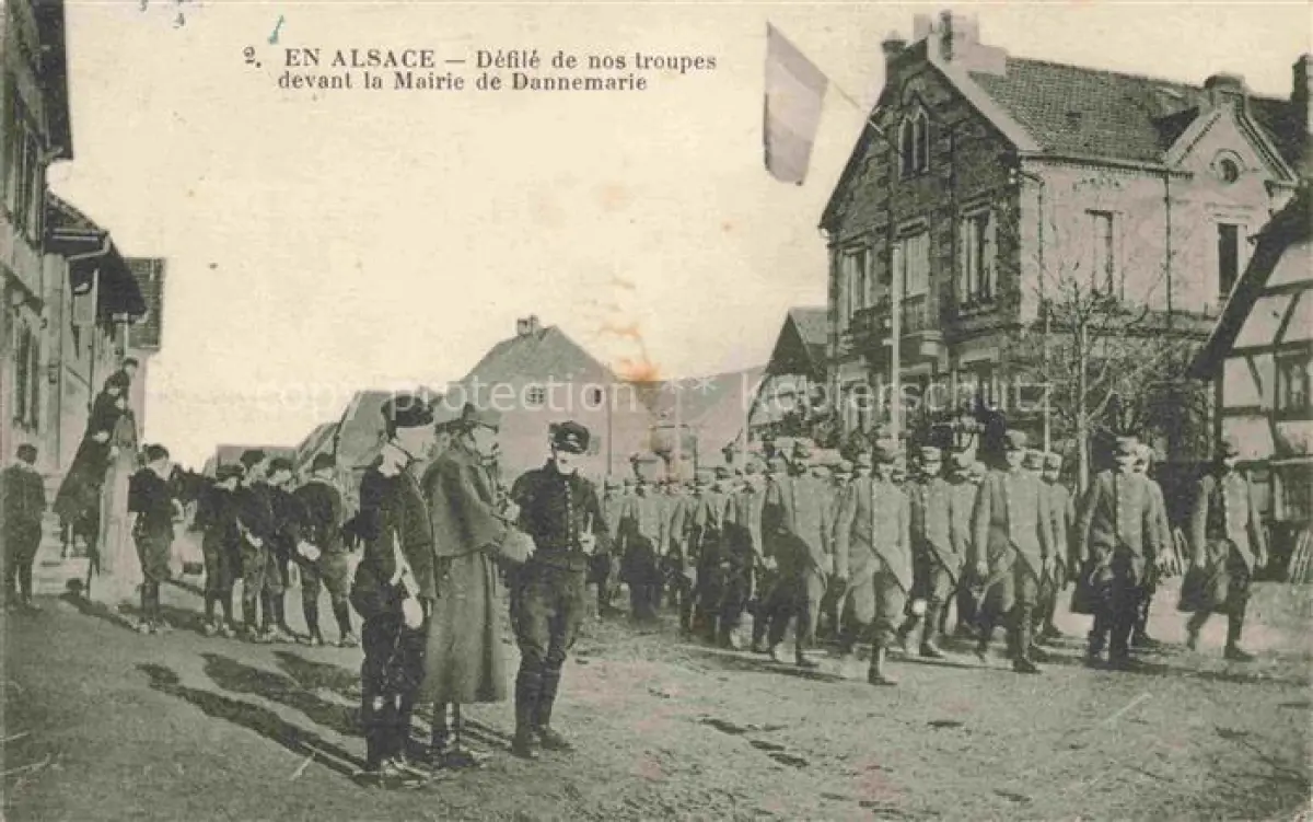 14099585 DANNEMARIE Dammerkirch Alsace 68 Haut-Rhin Défilé de nos troupes devant la Mairie postalisch gelaufen Erhaltung siehe scans [FriedD77] carte postale Frie Katcode 11170068168068