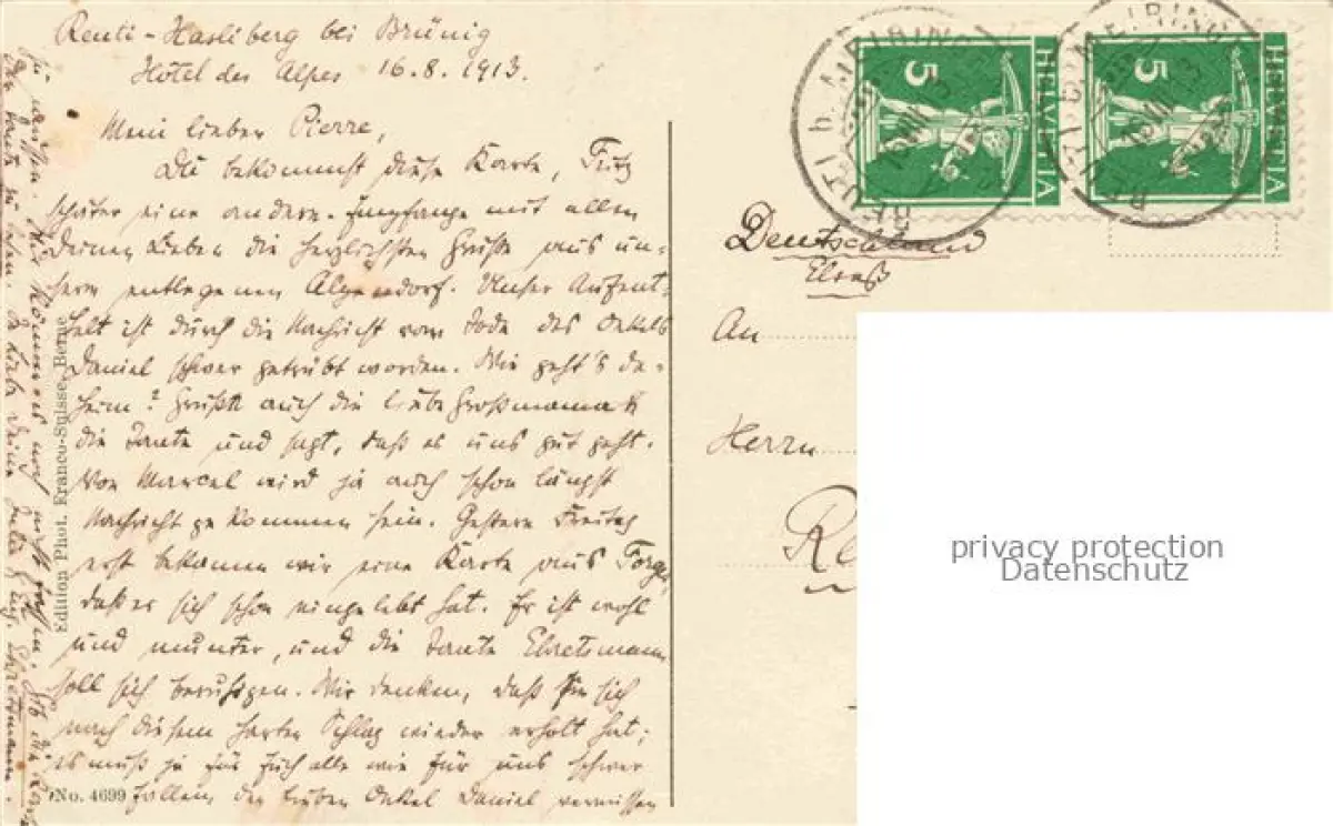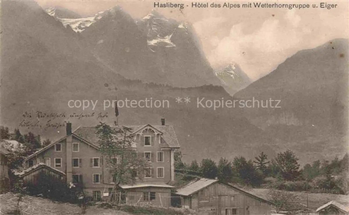 alte Postkarte Hasliberg Bruenig BE Hôtel des Alpes mit Wetterhorngruppe und Eiger Berner Alpen postalisch gelaufen Erhaltung siehe scans [FriedD77]
