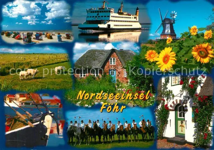 AK / Ansichtskarte Insel_Foehr Strand Faehre Windmuehle Sonnenblume Reetdachhaus Fischkutter Pferdesport Haustuer Architektur Insel_Foehr